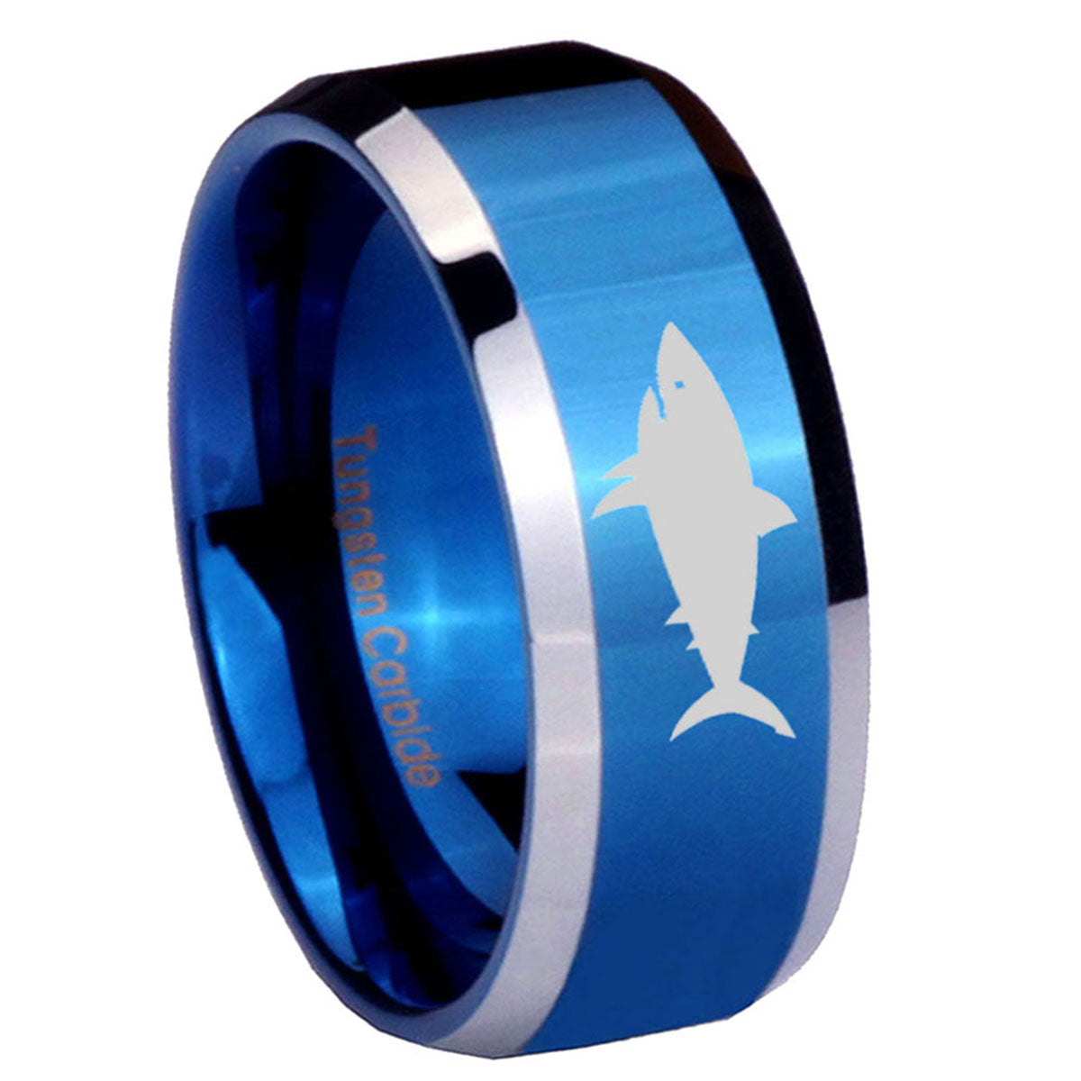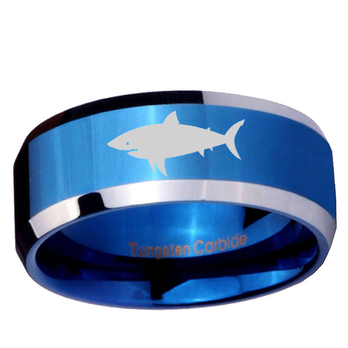 Propose with the 10mm Shark Beveled Edges Blue 2 Tone Tungsten Men's Engagement Ring. This blue and black 2-tone tungsten ring with Shark design is ideal for engagements.