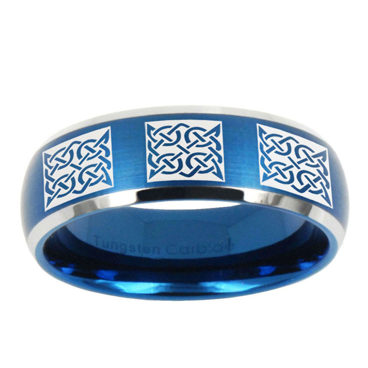 Intruding 5, 8mm Multiple Celtic Dome Brushed Blue 2 Tone Tungsten Carbide Rings for Men . Offer in both 5mm and 8mm band width brushed blue 2 tone plated finished from size 4 to 14
