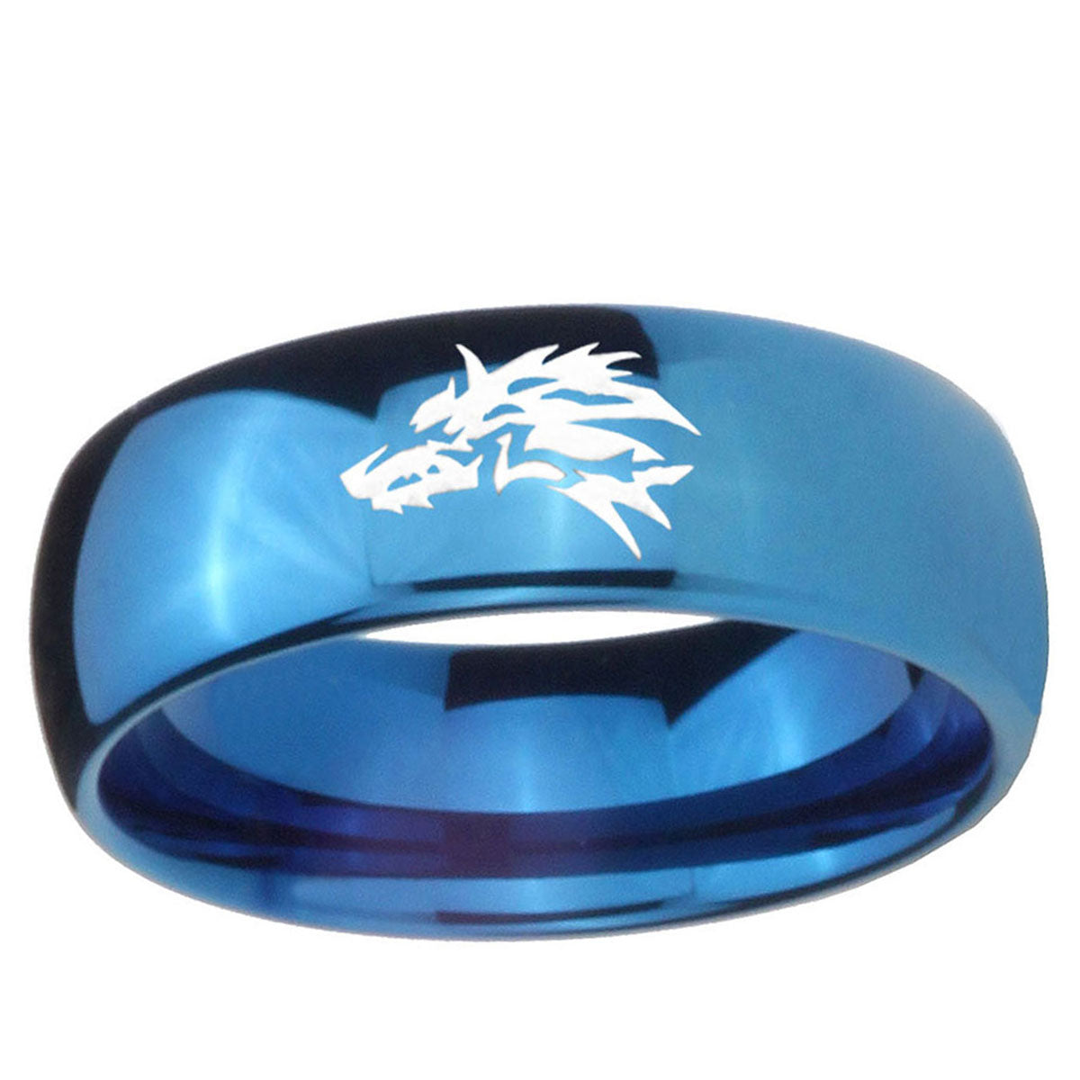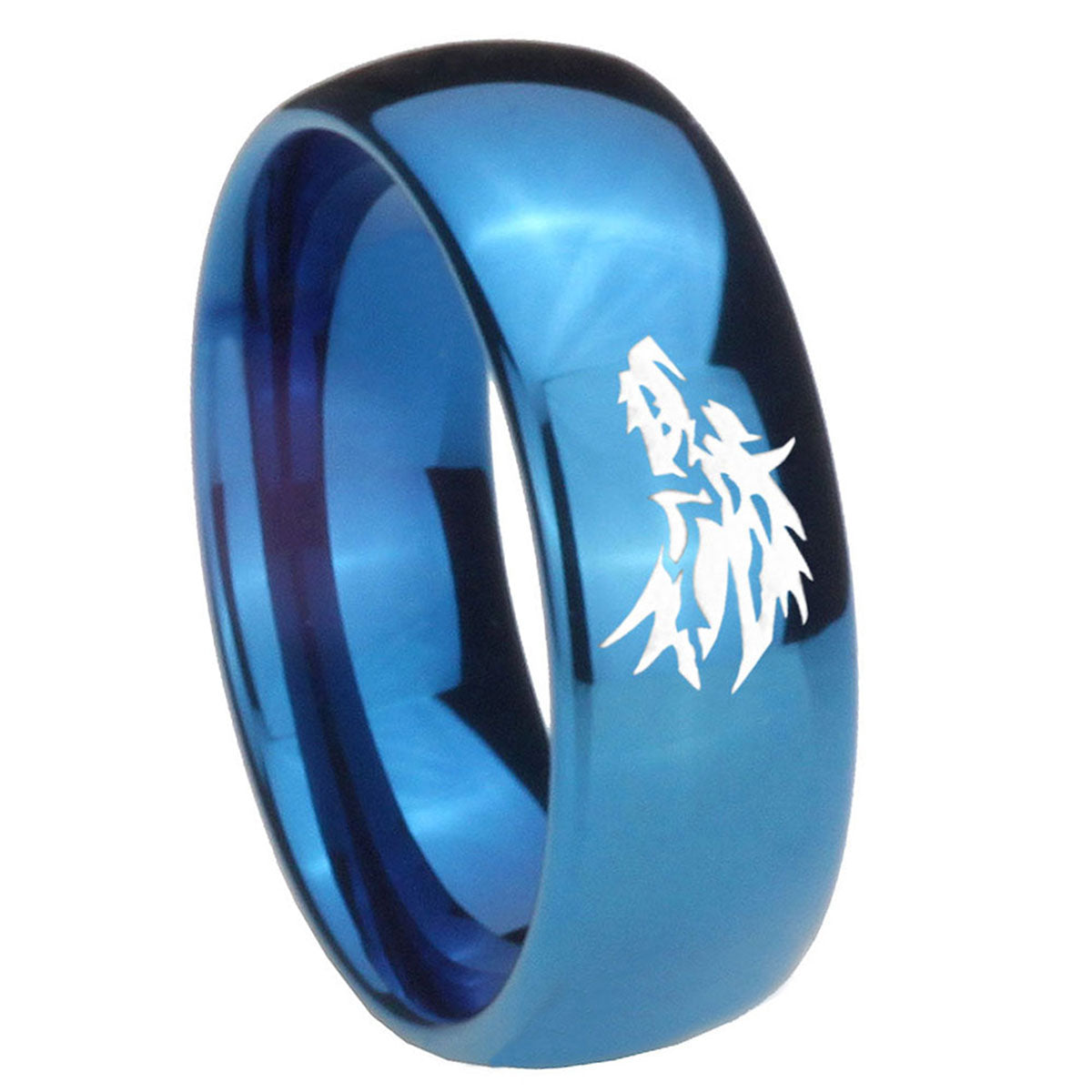 Intruding 5, 8mm Wolf Dome Blue Tungsten Carbide Mens Engagement Band . Offer in both 5mm and 8mm band width polished blue plated finished from size 4 to 14
