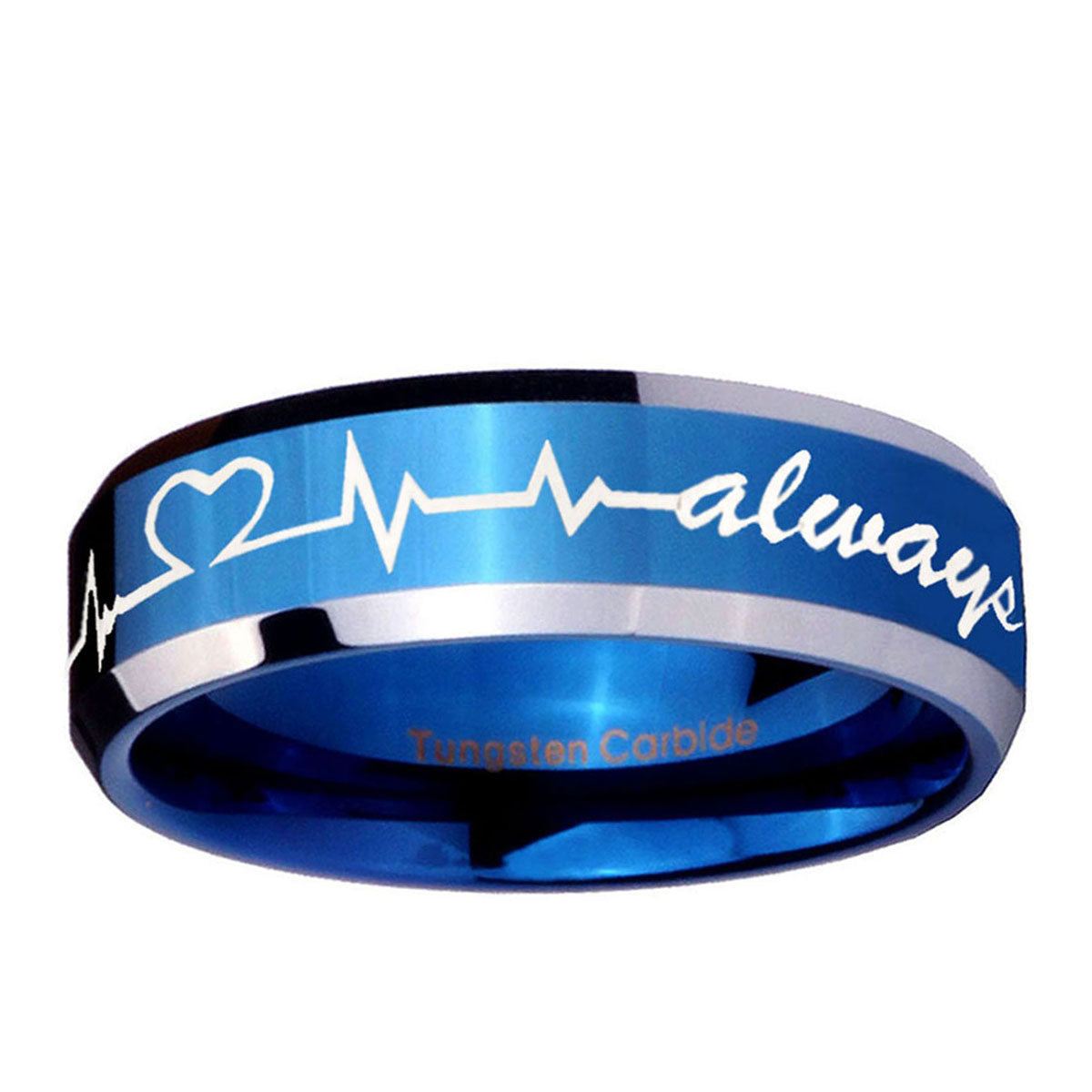 5, 8mm Heart Beat forever Heart always Beveled Blue 2 Tone Tungsten Mens Bands Ring