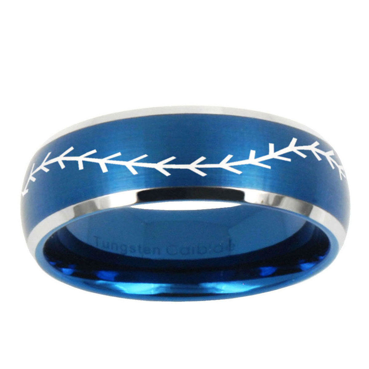 Intruding 5, 8mm Baseball Stitch Dome Brushed Blue 2 Tone Tungsten Carbide Wedding Band Ring . Offer in both 5mm and 8mm band width brushed blue 2 tone plated finished from size 4 to 14