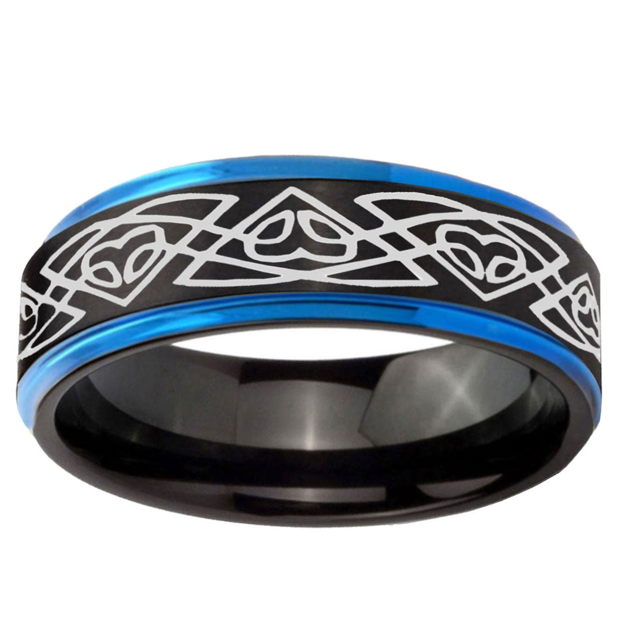 Intruding 5, 8mm Celtic Braided Blue Step Edges Tungsten Carbide Men's Wedding Ring . Offer in both 5mm and 8mm band width black and blue plated finished from size 4 to 14