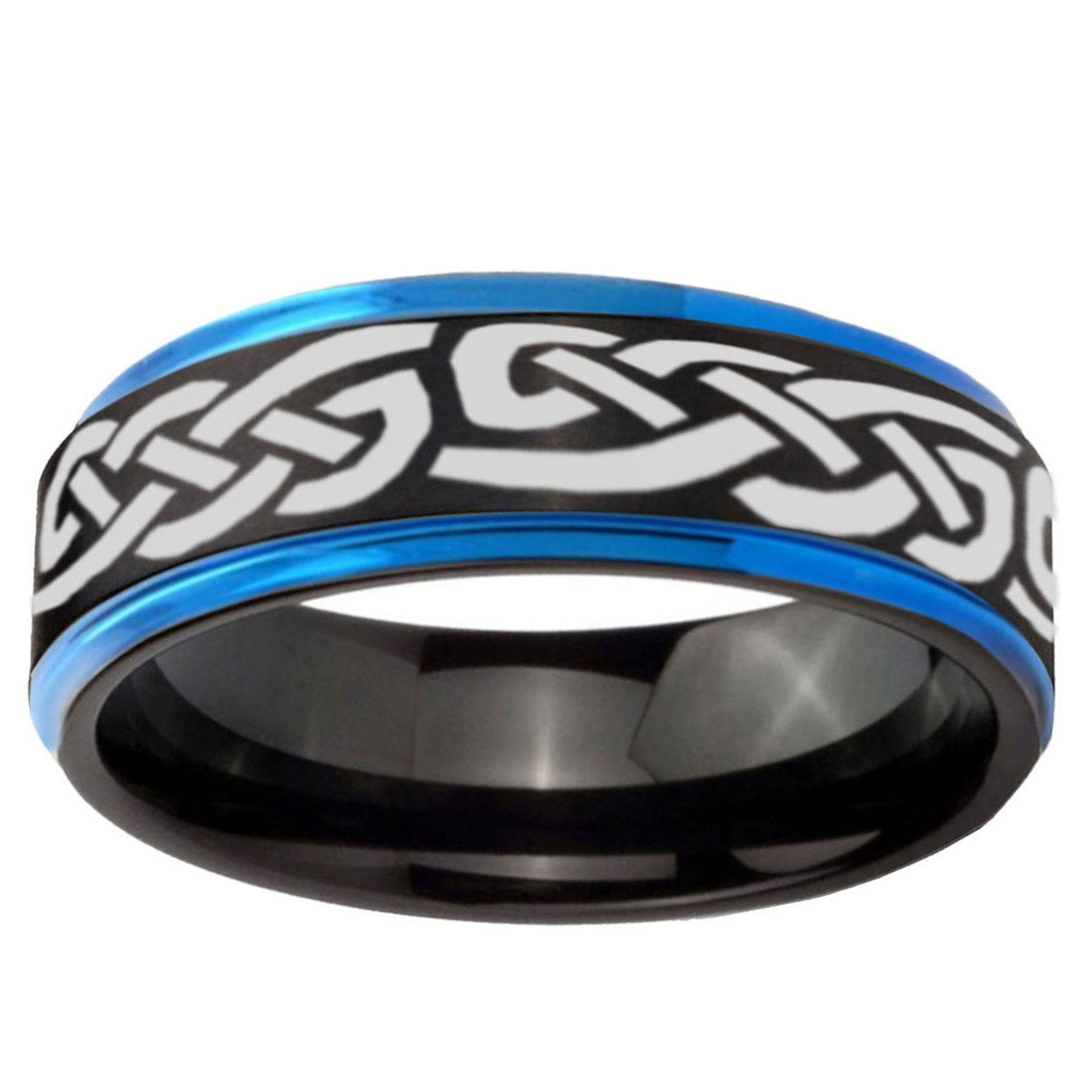 5, 8mm Celtic Knot Infinity Love Blue Step Edge Black Tungsten Engraved Ring