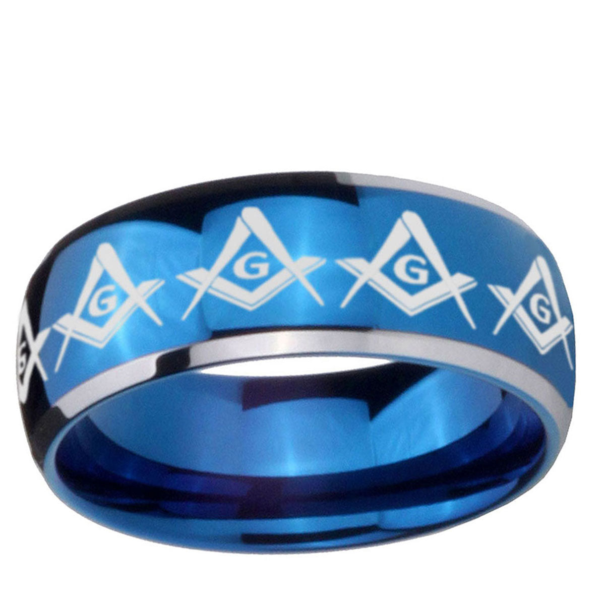 Intruding 5, 8mm Masonic Square and Compass Dome Blue 2 Tone Tungsten Carbide Mens Wedding Band . Offer in both 5mm and 8mm band width polished blue plated 2 tone finished from size 4 to 14