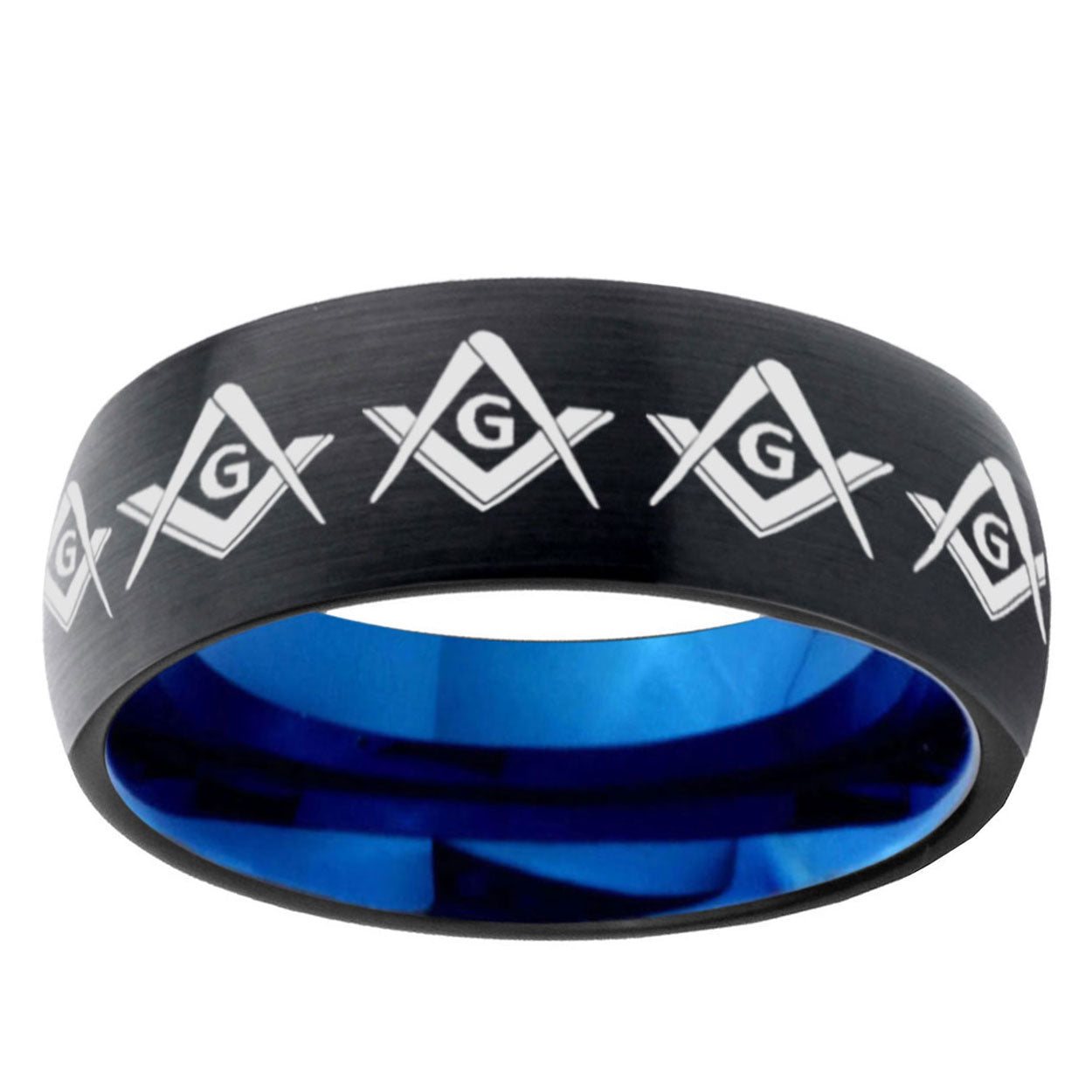 Propose with the 10mm Masonic Square and Compass Dome Tungsten Carbide Blue Engagement Ring. This blue tungsten dome ring with Masonic Square and Compass design is ideal for engagements.