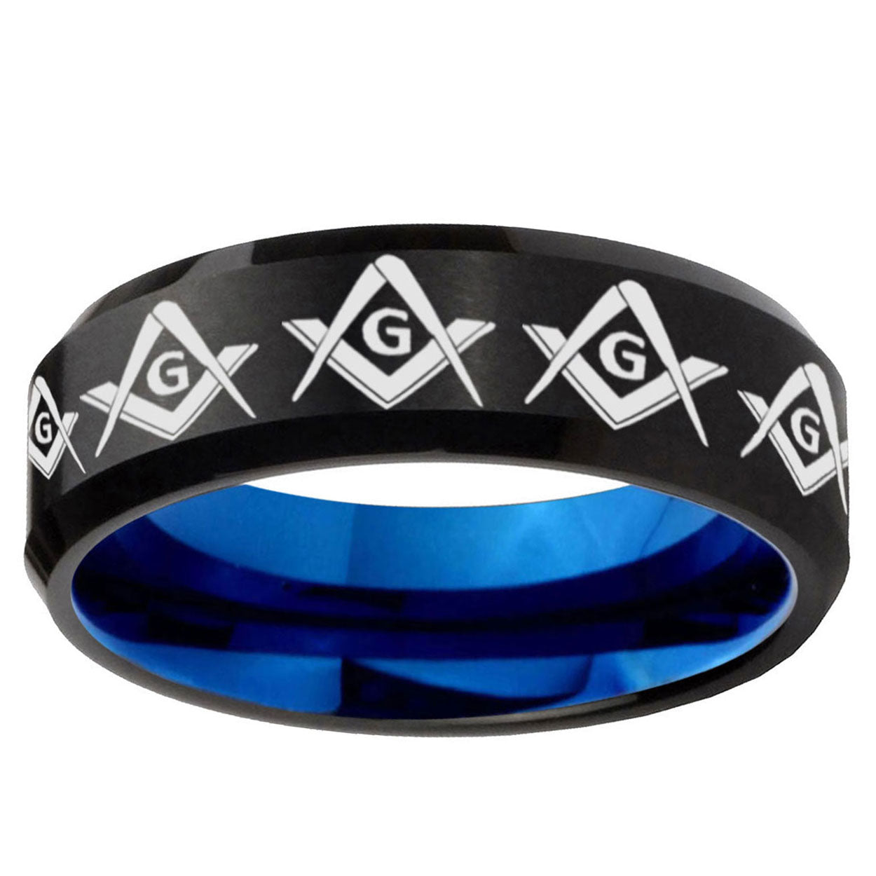 Celebrate with the 10mm Masonic Square and Compass Bevel Tungsten Carbide Blue Wedding Ring. This blue tungsten ring with Masonic Square and Compass design is perfect for weddings.