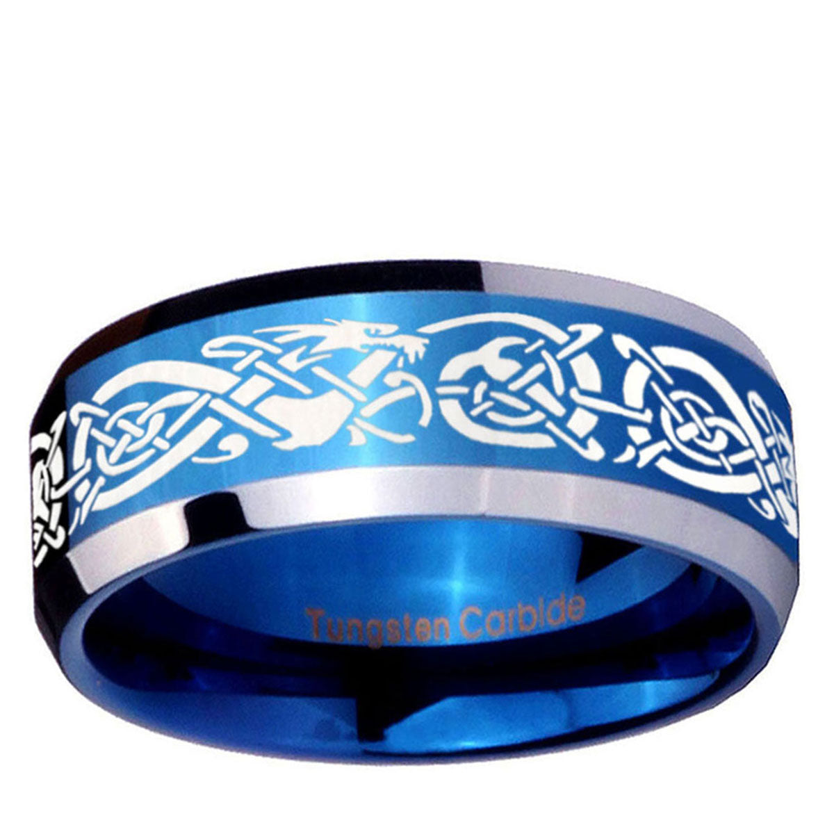 Celebrate with the 10mm Celtic Knot Dragon Beveled Edges Blue 2 Tone Tungsten Wedding Band Ring. This blue and black 2-tone tungsten ring with Celtic knot dragon design is ideal for weddings.