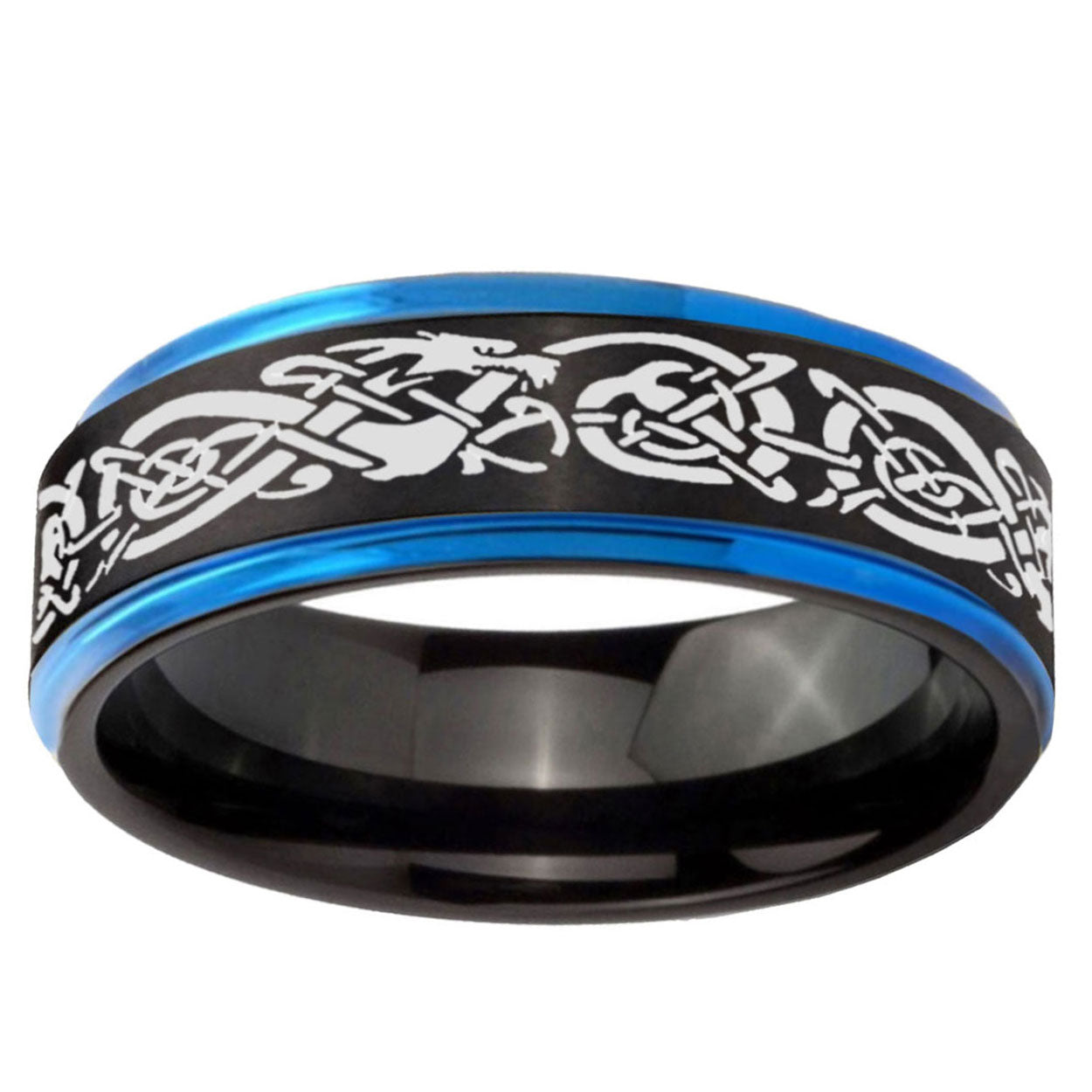 10mm Celtic Dragon Blue Step Edges Brushed Tungsten Carbide Mens Promise Ring