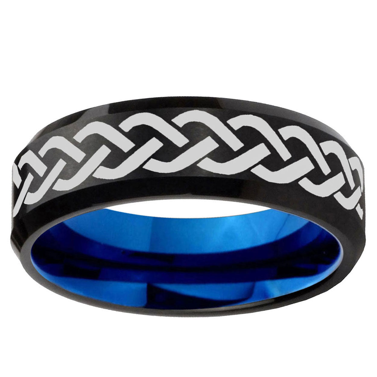 Celebrate with the 10mm Laser Celtic Knot Bevel Tungsten Carbide Blue Wedding Ring. This blue tungsten ring with Laser Celtic Knot design is perfect for weddings.