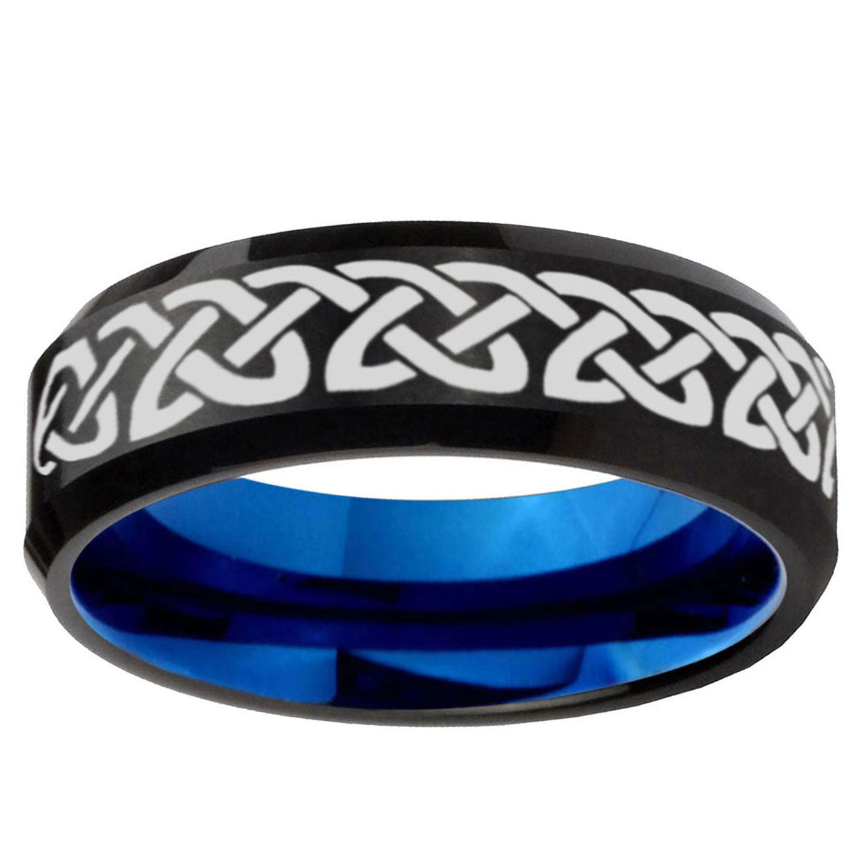 Celebrate love with the 10mm Celtic Knot Love Bevel Tungsten Carbide Blue Wedding Ring. This blue tungsten ring with Celtic knot love design is perfect for weddings.