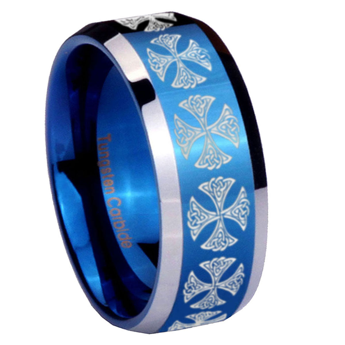 Intruding 5, 8mm Medieval Cross Beveled Edges Blue 2 Tone Tungsten Mens Ring Engraved . Offer in both 5mm and 8mm band width blue plated 2 tone finished from size 4 to 14