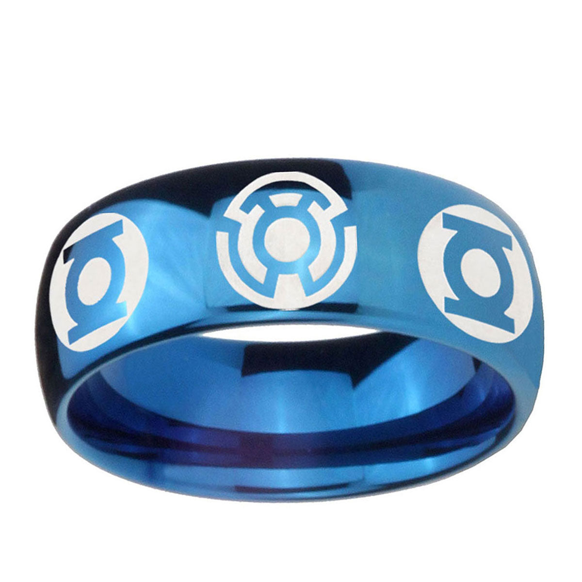 Intruding 5, 8mm Blue Green Lantern Dome Blue Unique Men's Wedding Rings . Offer in both 5mm and 8mm band width polished blue plated finished from size 4 to 14