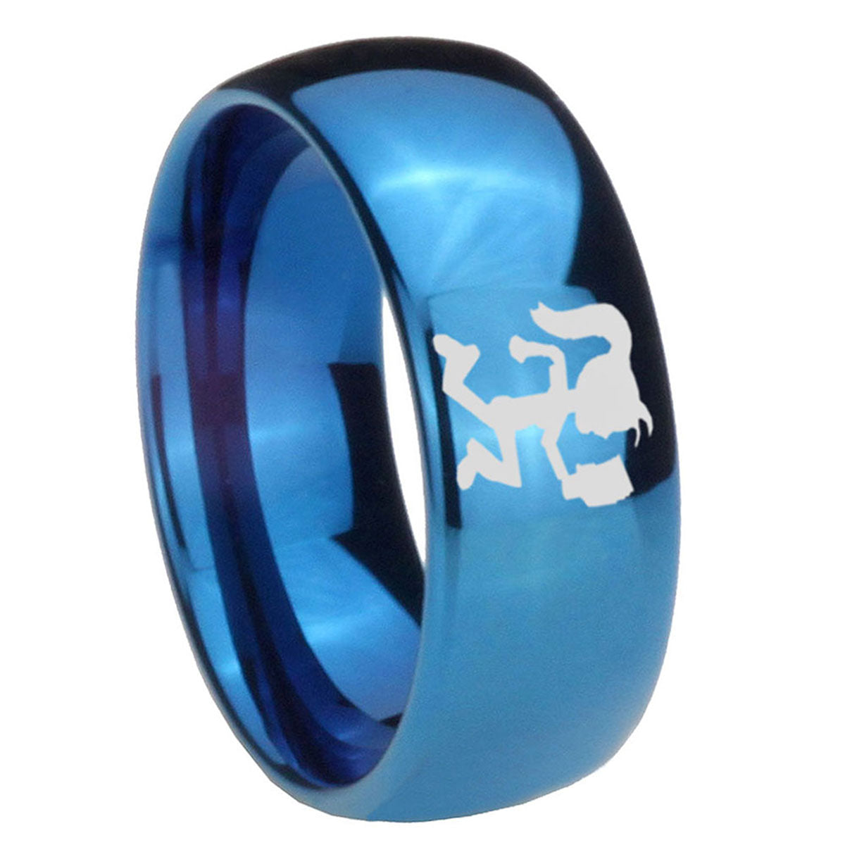 Intruding 5, 8mm Hatchet Woman Dome Blue Tungsten Carbide Men's Wedding Band . Offer in both 5mm and 8mm band width polished blue plated finished from size 4 to 14