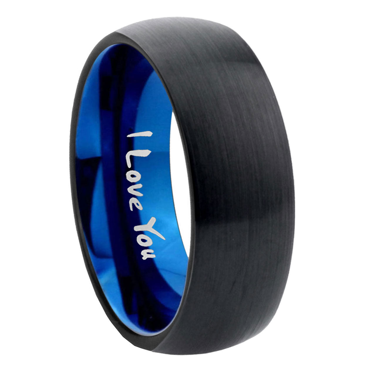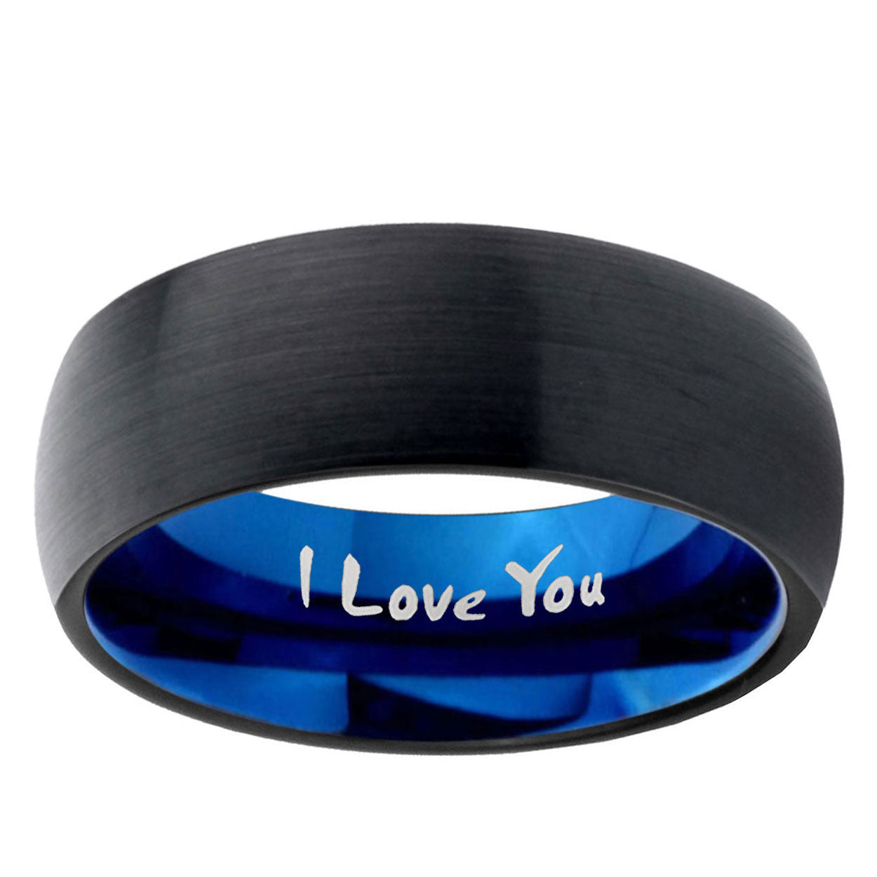 Intruding 5, 8mm I Love You Dome Black And Blue Tungsten Carbide Men's Engagement Ring . Offer in both 5mm and 8mm band width black and blue plated finished from size 4 to 14
