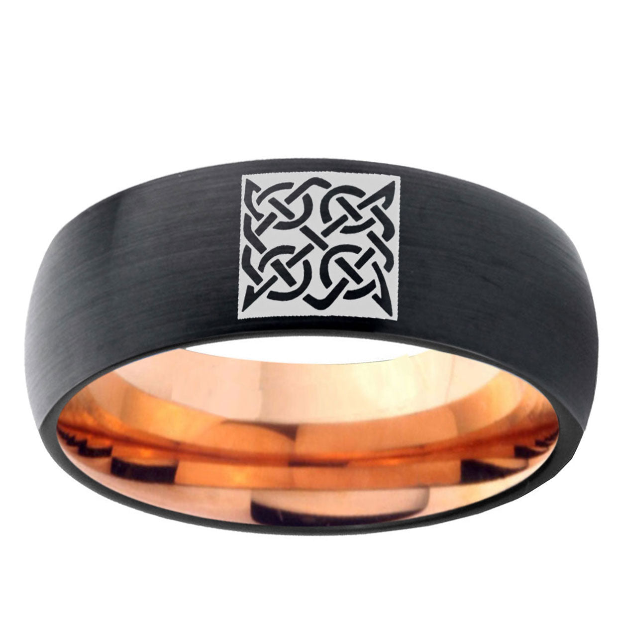 Intruding 5, 8mm Celtic Design Dome Black And Rose Gold Tungsten Carbide Men's Bands Ring . Offer in both 5mm and 8mm band width Black And Rose Gold plated finished from size 4 to 14
