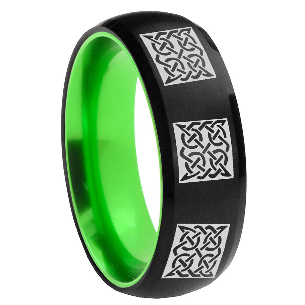 Intruding 8mm Multiple Celtic Dome Black And Green Tungsten Carbide Promise Ring . Offer in men wedding band in 8mm band width Black And Green plated finished from size 7 to 14