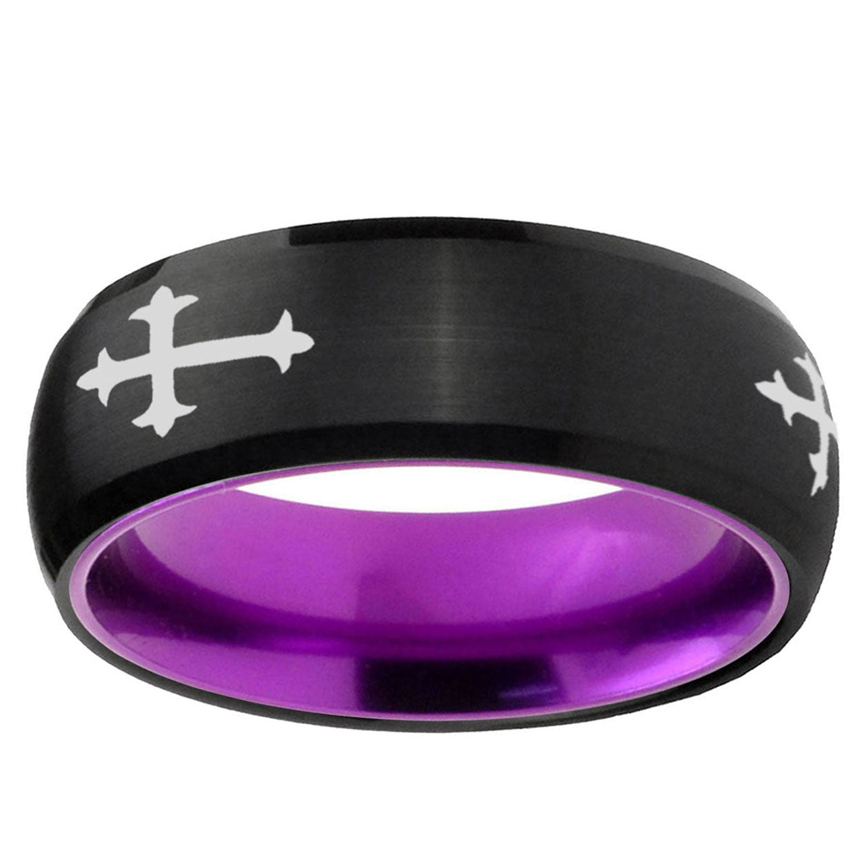 8mm Christian Cross Religious Dome Black And Purple Tungsten Promised Ring