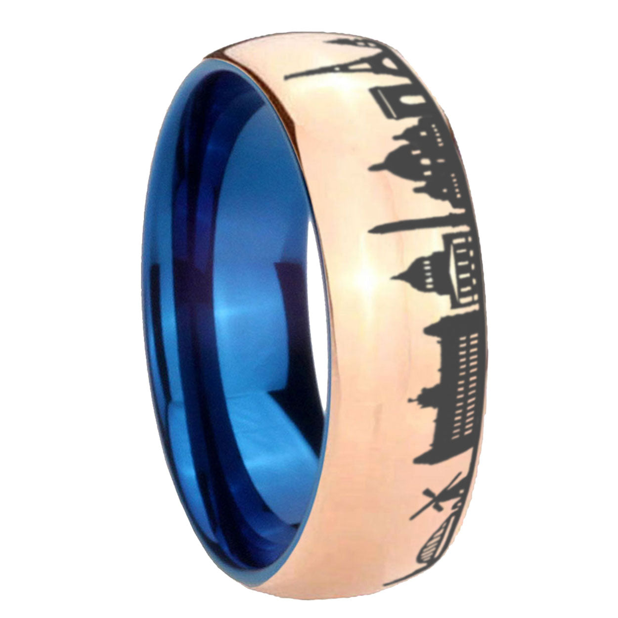 Intruding 8mm France Paris City Dome Polish Rose Gold Tungsten Blue Plated Inside Mens Ring. Offer in 8mm band width blue and rose gold plated finished from size 7 to 14
