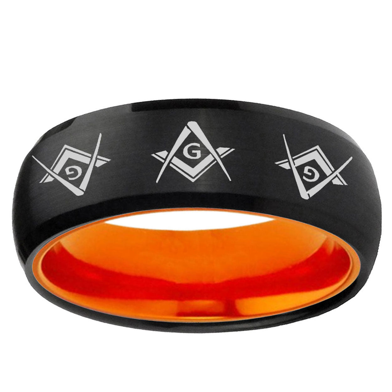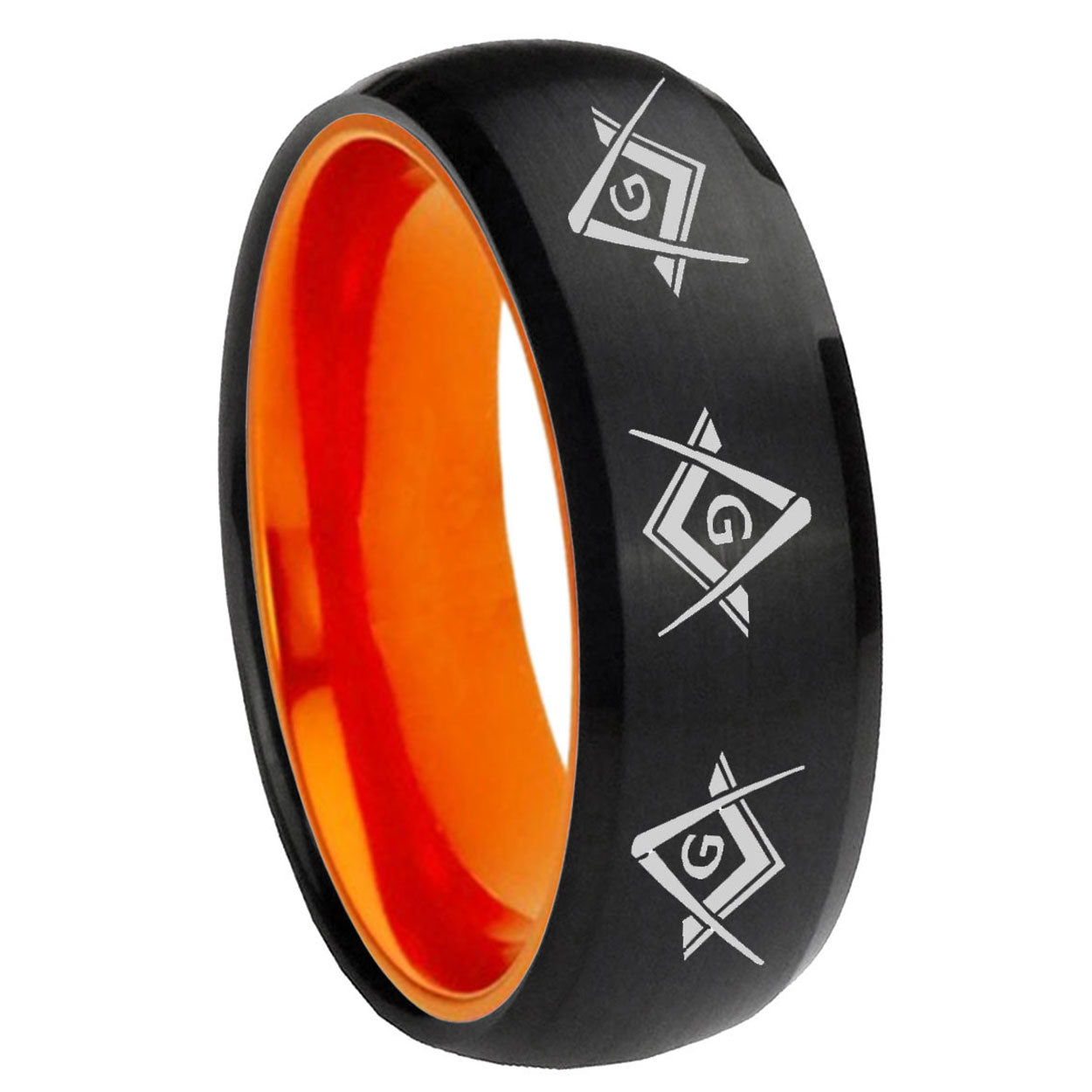 Intruding 8mm Master Mason Masonic Dome Black And Orange Tungsten Men's Bands Ring . Offer in men wedding band in 8mm band width Black And Orange plated finished from size 7 to 14