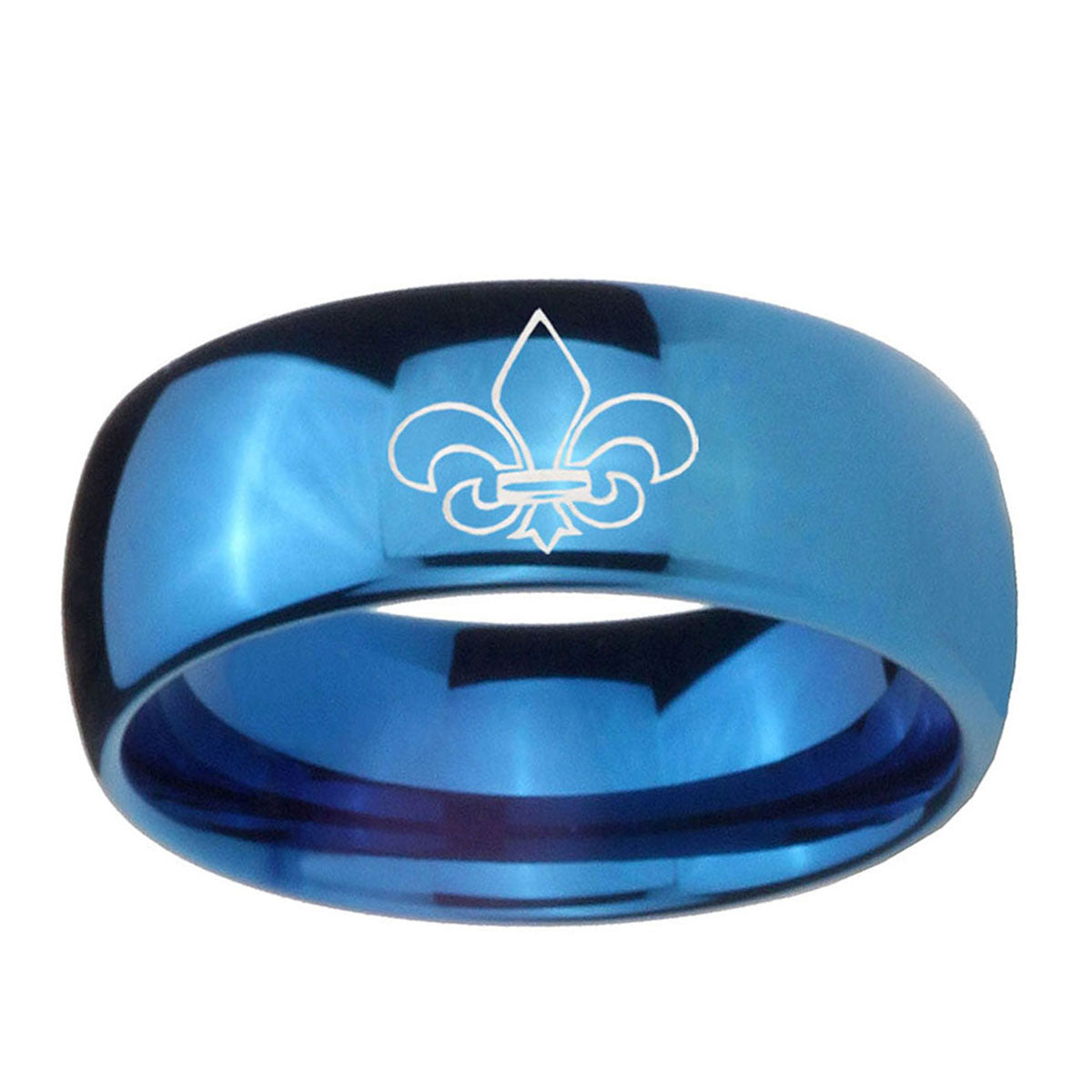 Intruding 5, 8mm Fleur-De-Lis Dome Blue Tungsten Carbide Men's Wedding Band . Offer in both 5mm and 8mm band width polished blue plated finished from size 4 to 14