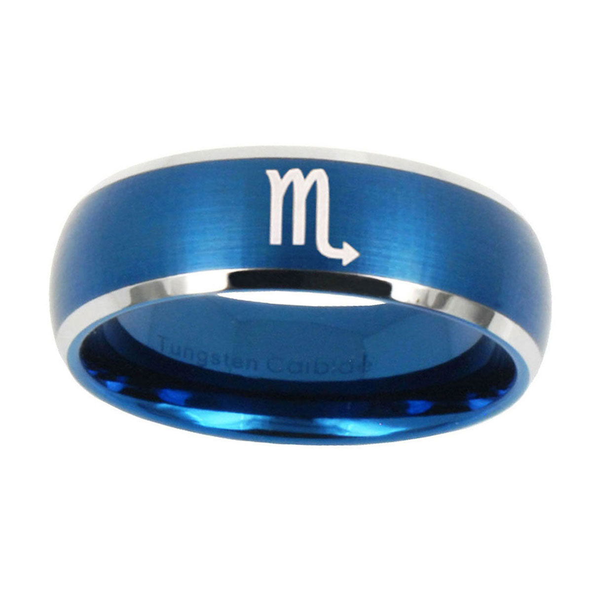 Style the 10mm Scorpio Horoscope Dome Brushed Blue 2 Tone Tungsten Carbide Bands Ring. This blue and black 2-tone dome ring with Scorpio Horoscope design is perfect for men.