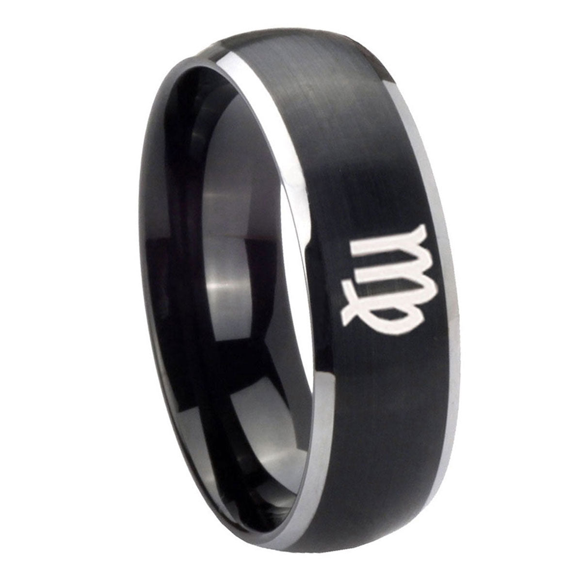 Introuding 5, 8mm Virgo Zodiac Dome Brushed Black 2 Tone Tungsten Carbide Mens Wedding Band . Offer in both 5mm and 8mm band width brushed black plated fnished from size 4 to 14