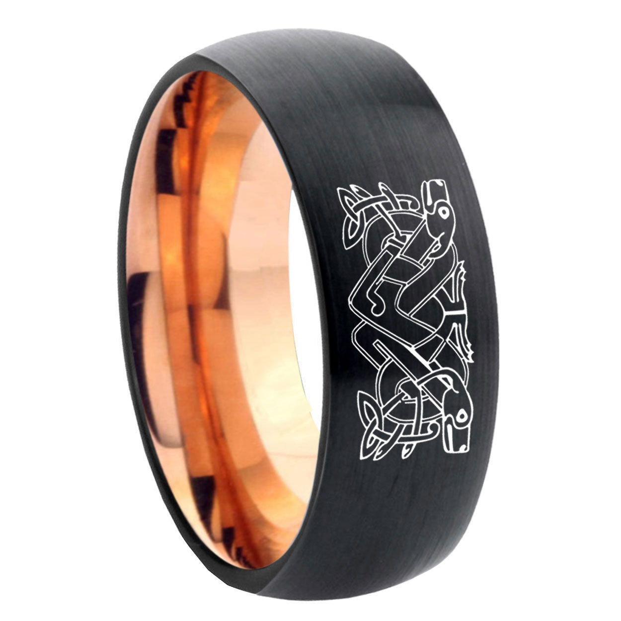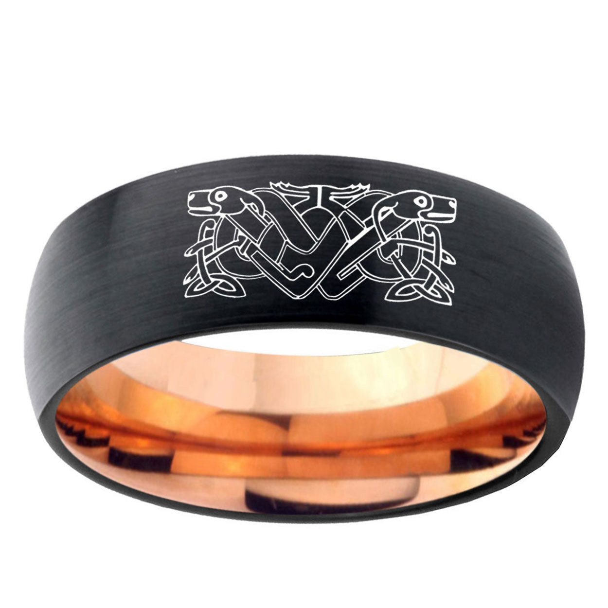 Customize the 10mm Celtic Dog Dome Tungsten Rose Gold Custom Ring for Men. This rose gold tungsten dome ring with Celtic dog design is perfect for personalization.