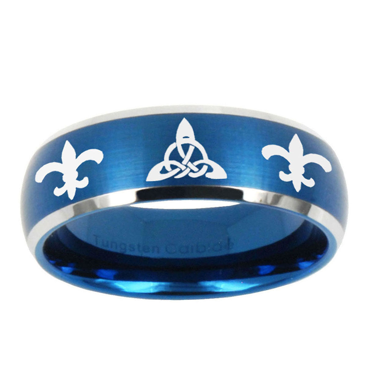 Celebrate with the 10mm Celtic Triangle Fleur-De-Lis Dome Brushed Blue 2 Tone Tungsten Bands Ring. This blue and black 2-tone dome ring with Celtic triangle Fleur-De-Lis design is perfect for weddings.