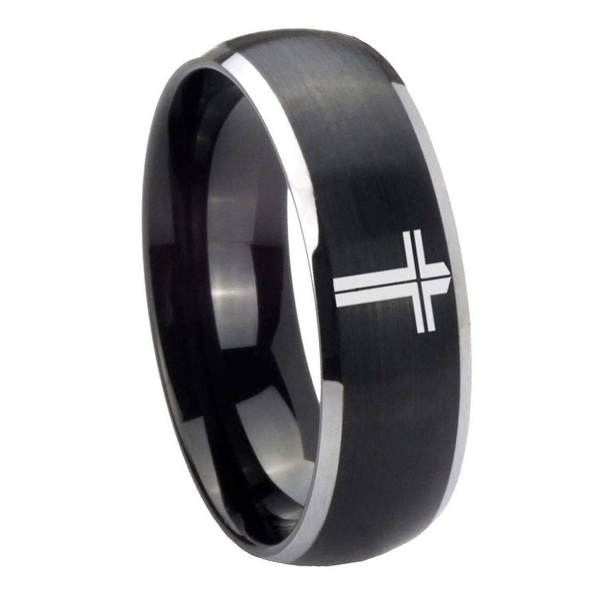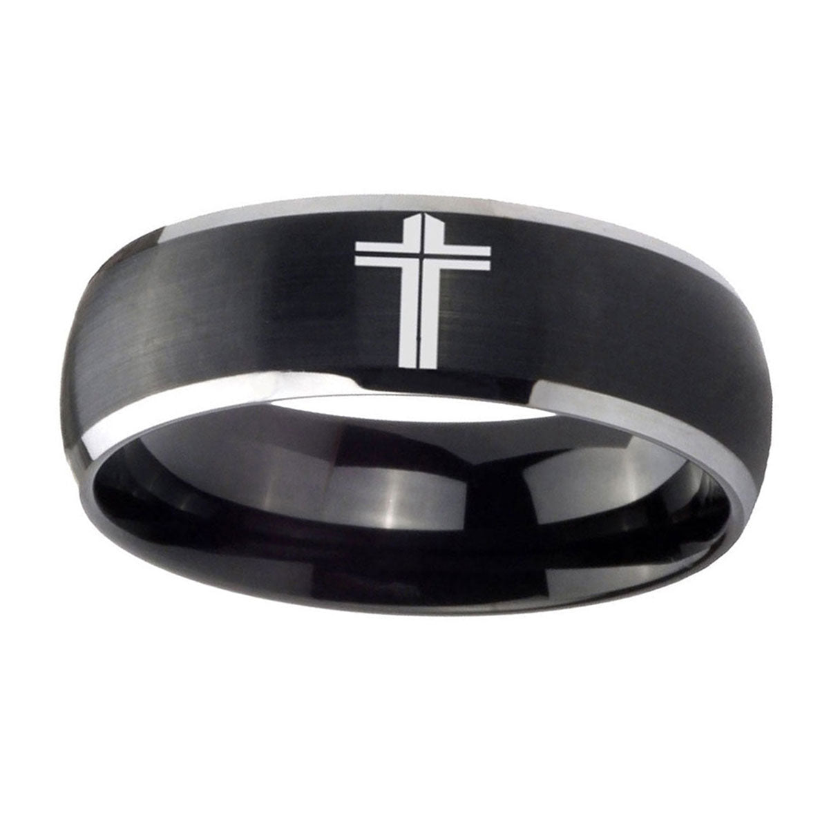 5, 8mm Flat Christian Cross Dome Brushed Black 2 Tone Tungsten Men's Band Ring