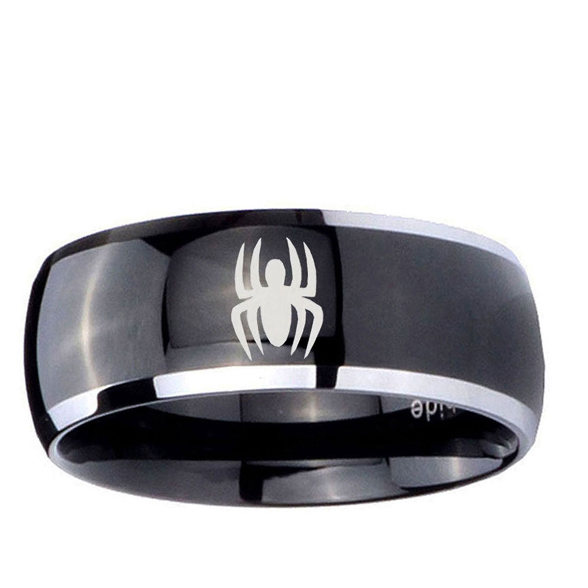 Intruding 5, 8mm Spiderman Dome Glossy Black 2 Tone Tungsten Carbide Anniversary Ring . Offer in both 5mm and 8mm band width polished black plated two tone finished from size 4 to 14