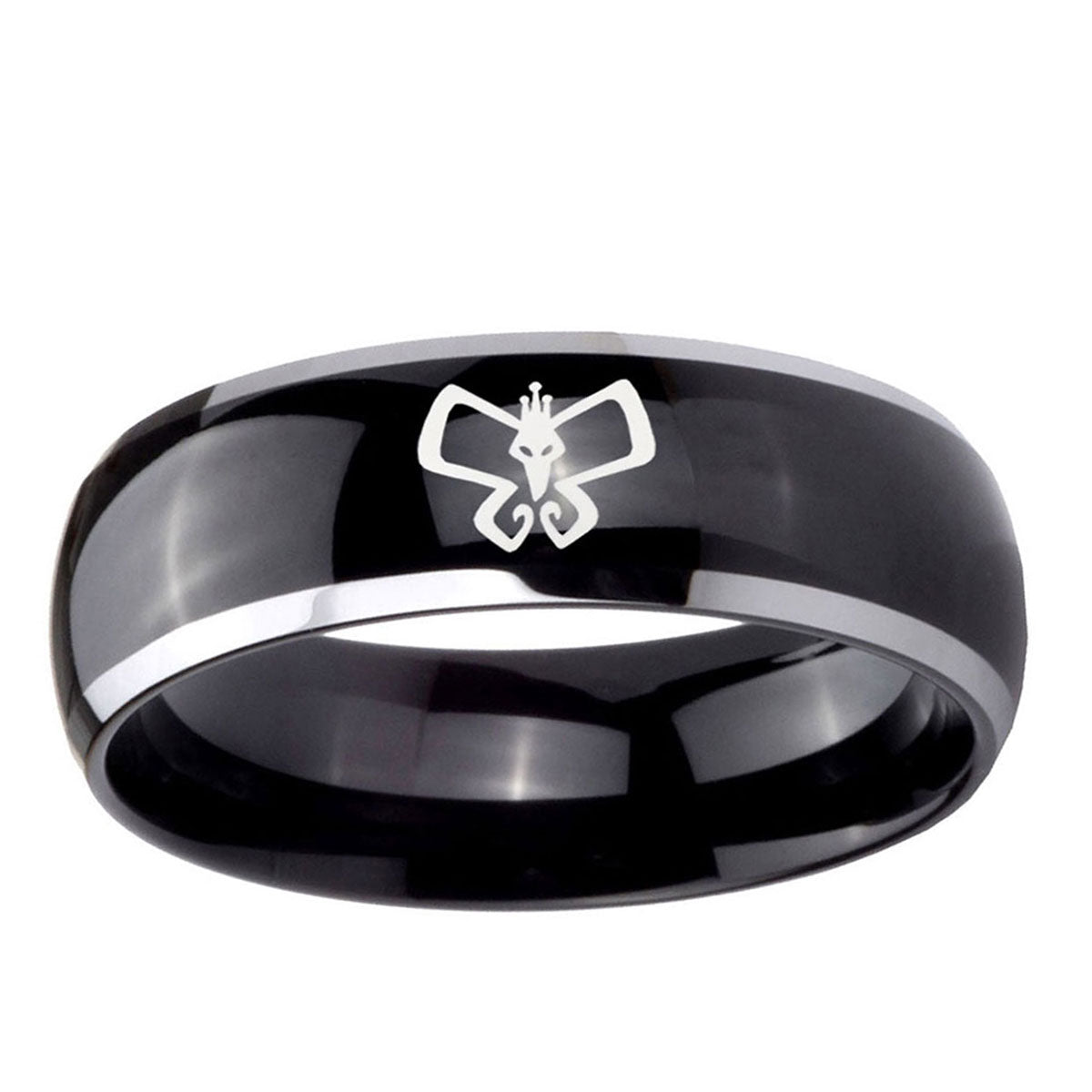 Make a promise with the 10mm Monarch Dome Glossy Black 2 Tone Tungsten Carbide Promise Ring. This glossy black and 2-tone dome ring with Monarch design is ideal for commitments.