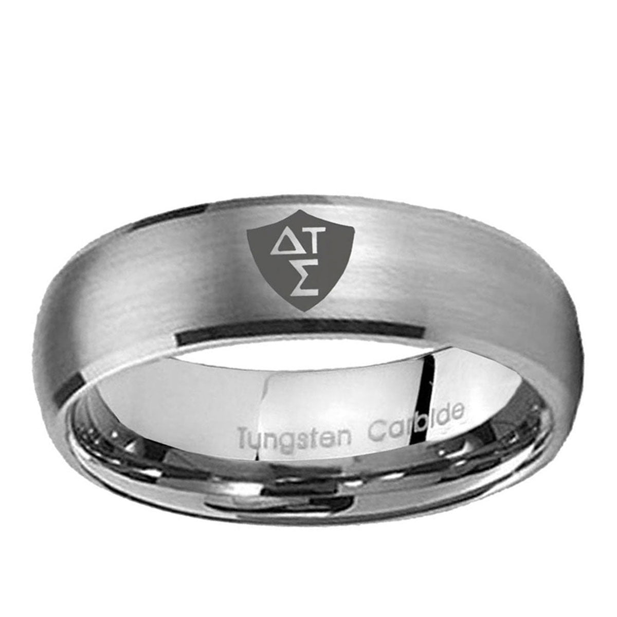 Personalize the 10mm Greek CTR Dome Brushed Tungsten Carbide Mens Ring Engraved. This brushed tungsten dome ring with Greek CTR design is perfect for custom engravings.