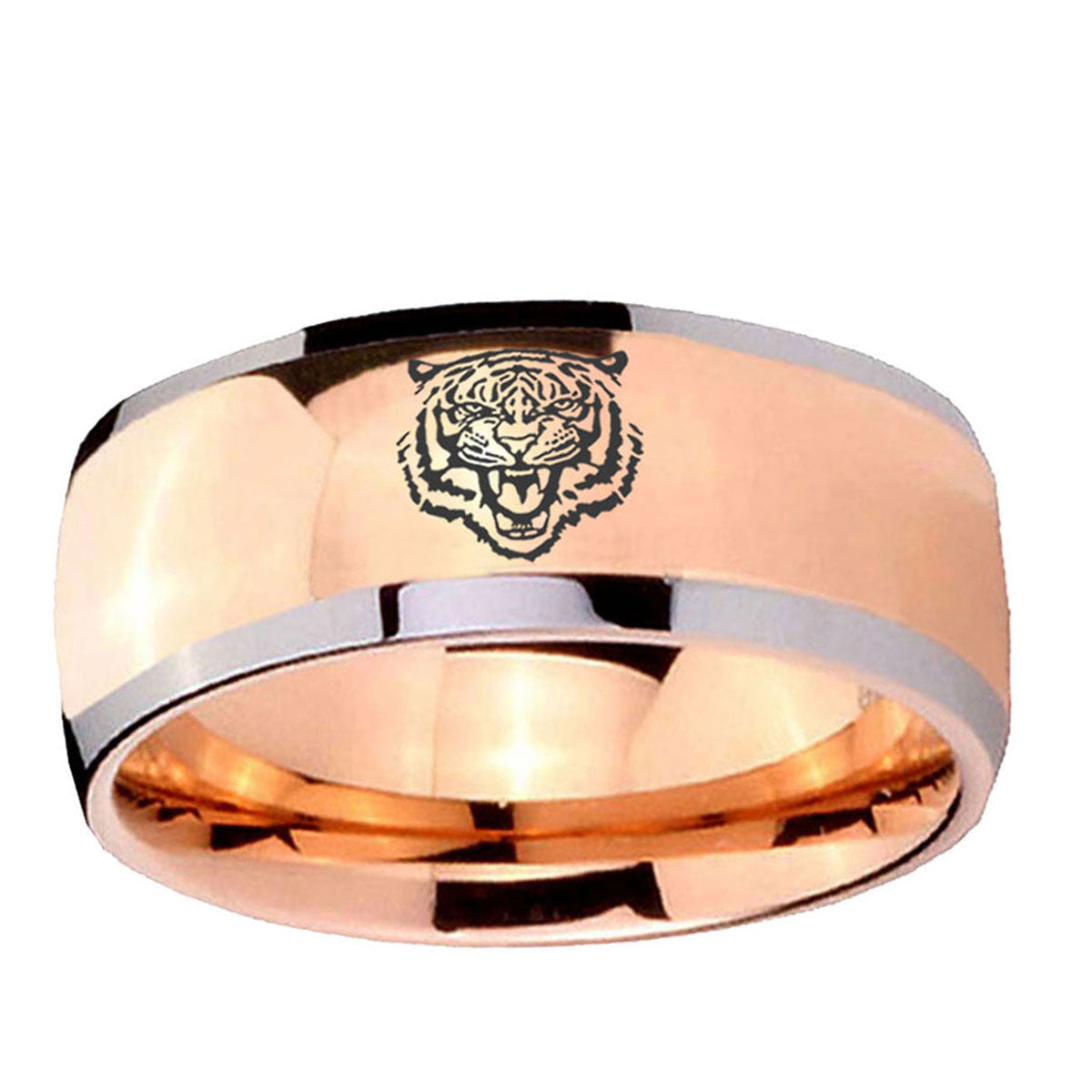 Intruding 5, 8mm Lion Dome Rose Gold Tungsten Carbide Men's Ring . Offer in both 5mm and 8mm band width two tone rose gold plated finished from size 4 to 14