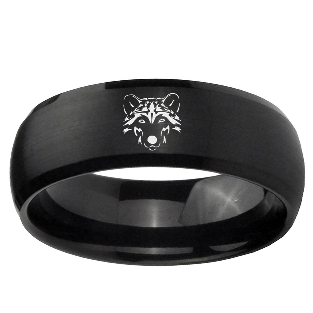 Propose with the 10mm Wolf Dome Brush Black Tungsten Carbide Men's Engagement Band. This brushed black dome ring with Wolf design is ideal for engagements.