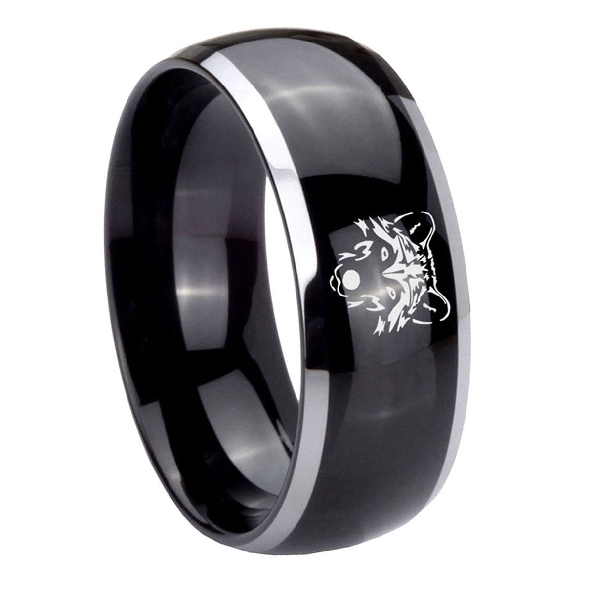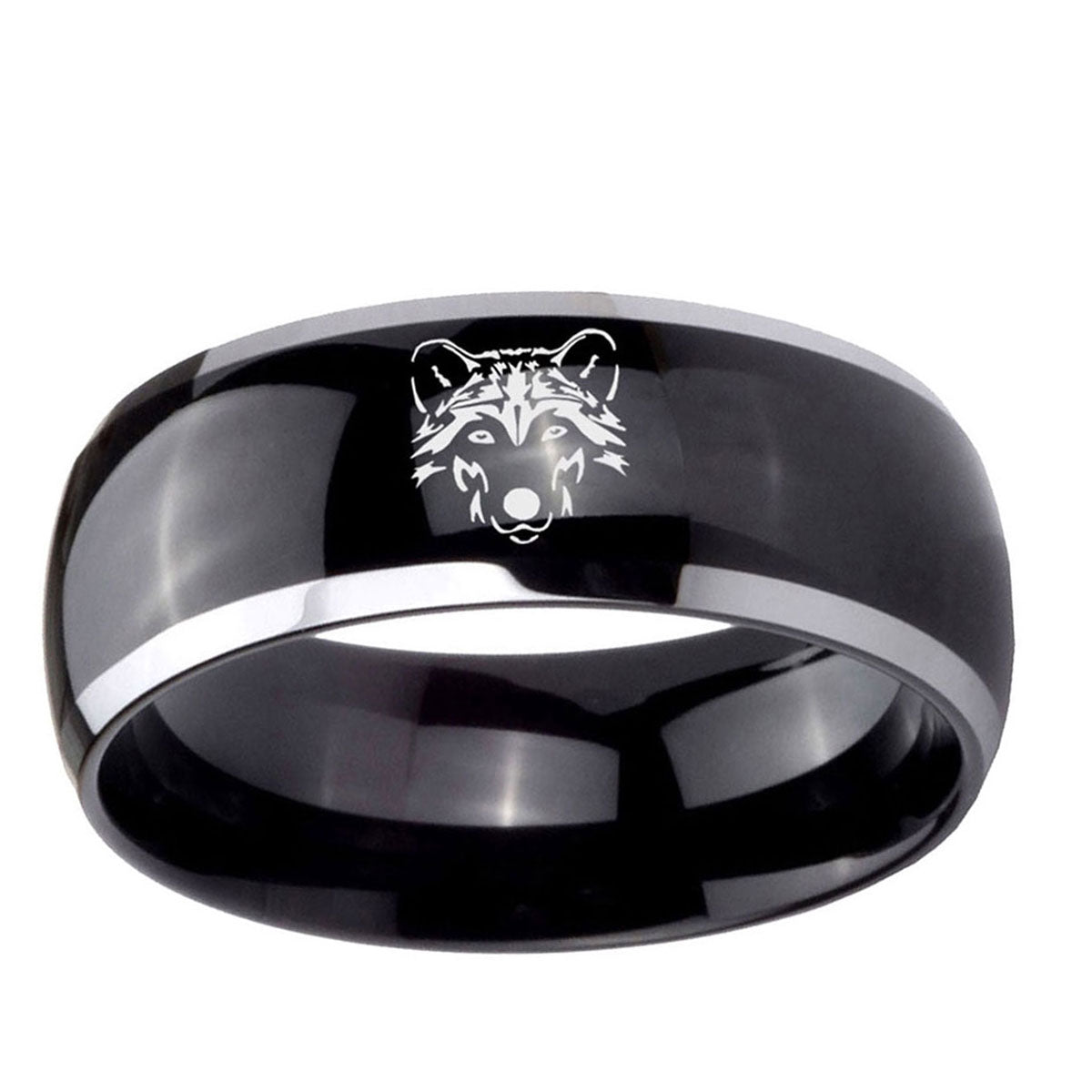 10mm Wolf Dome Glossy Black 2 Tone Tungsten Carbide Engraved Ring