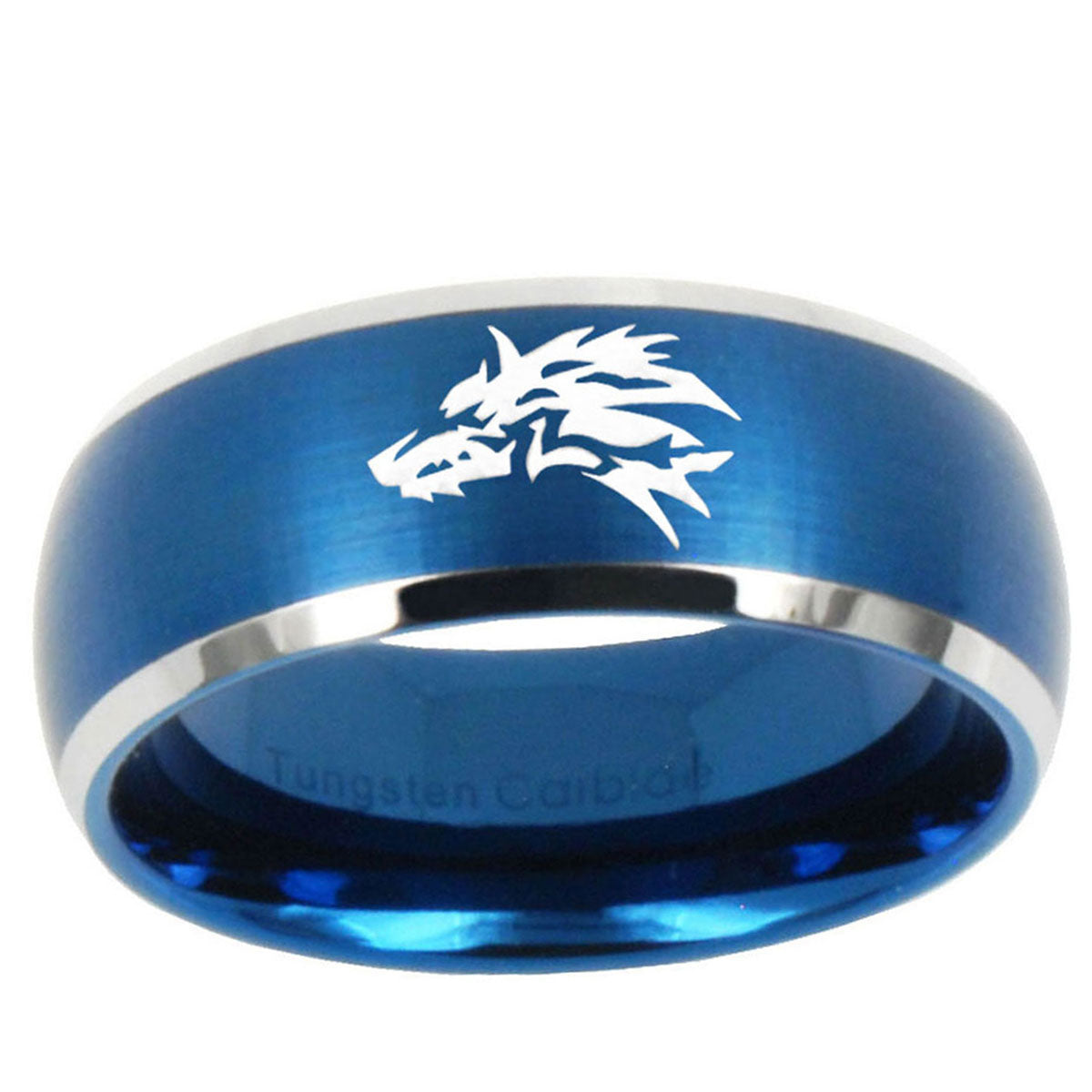 Propose with the 10mm Wolf Dome Brushed Blue 2 Tone Tungsten Carbide Men's Engagement Band. This blue and black 2-tone dome ring with Wolf design is ideal for engagements.