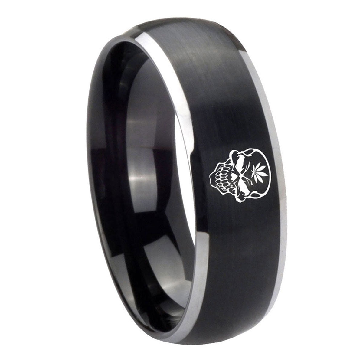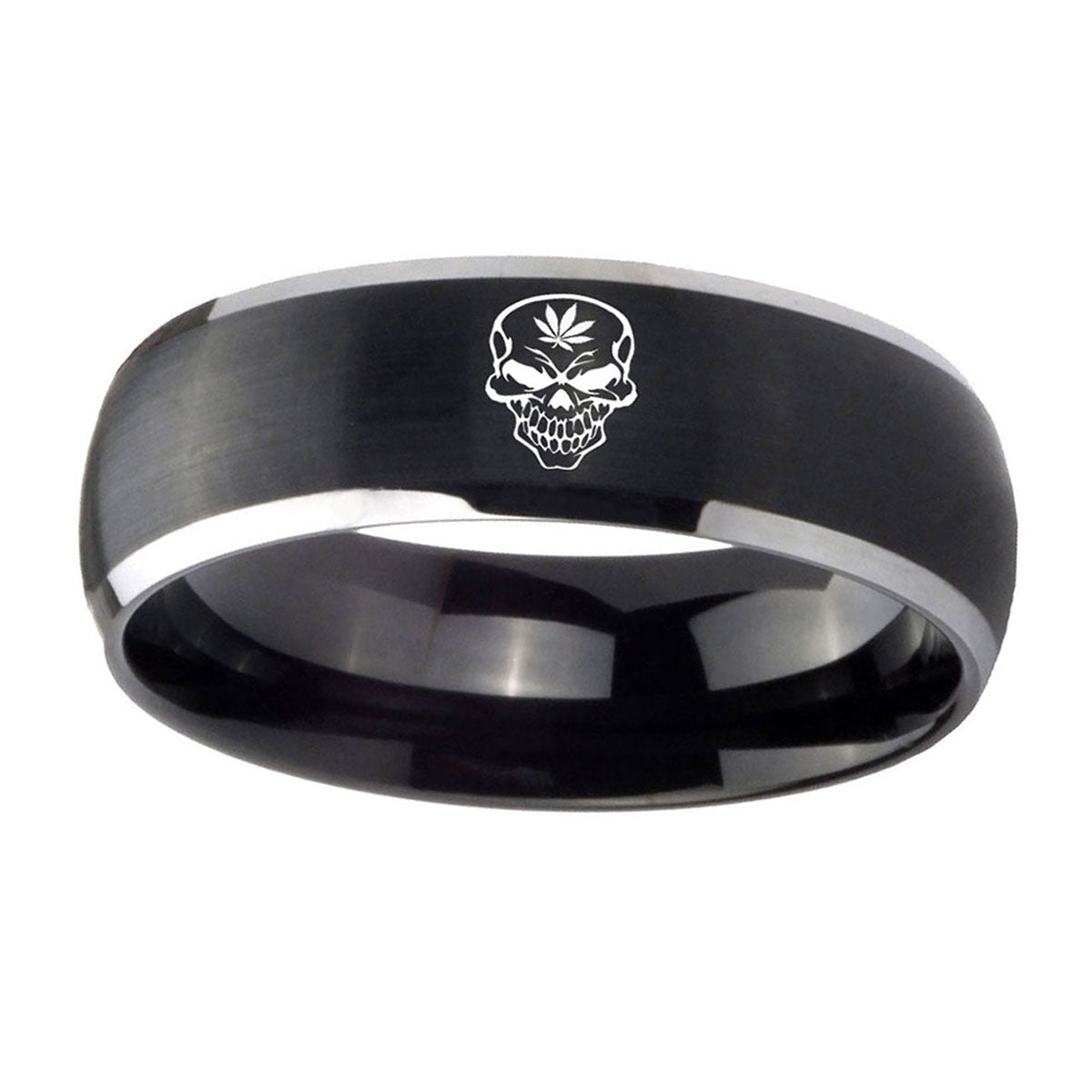 5, 8mm Skull Marijuana Leaf Dome Brushed Black 2 Tone Tungsten Promise Ring