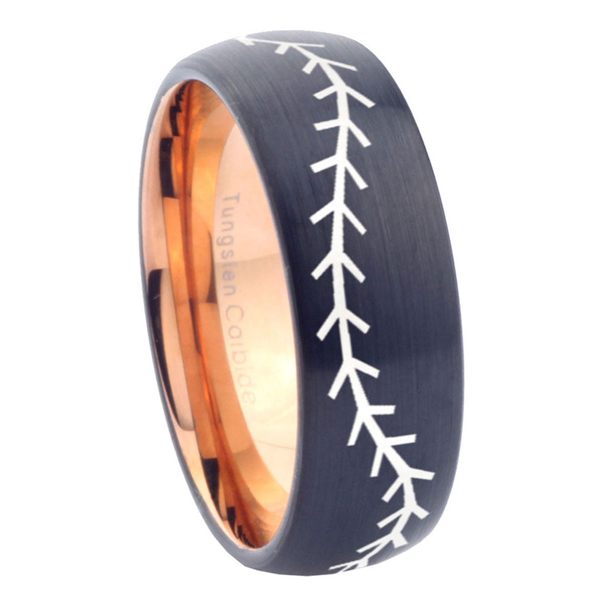 Introuding 5, 8mm Baseball Dome Tungsten Carbide Rose Gold Mens Ring Engraved . Offer in both 5mm and 8mm band width black and rose gold plated finished from size 4 to 14