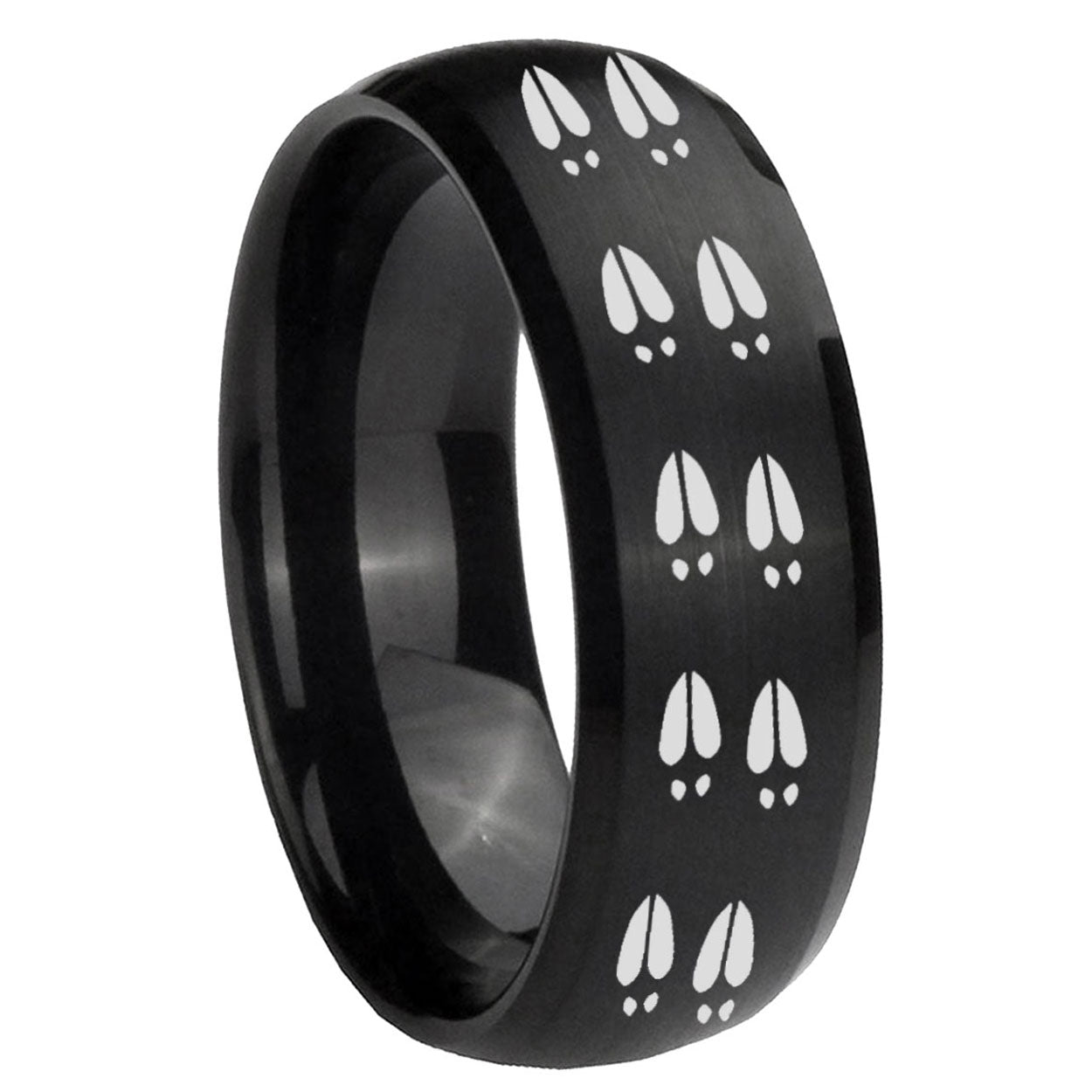Celebrate with the 10mm Deer Tracks Dome Brush Black Tungsten Carbide Wedding Band Mens. This brushed black dome ring with Deer Tracks design is perfect for weddings.