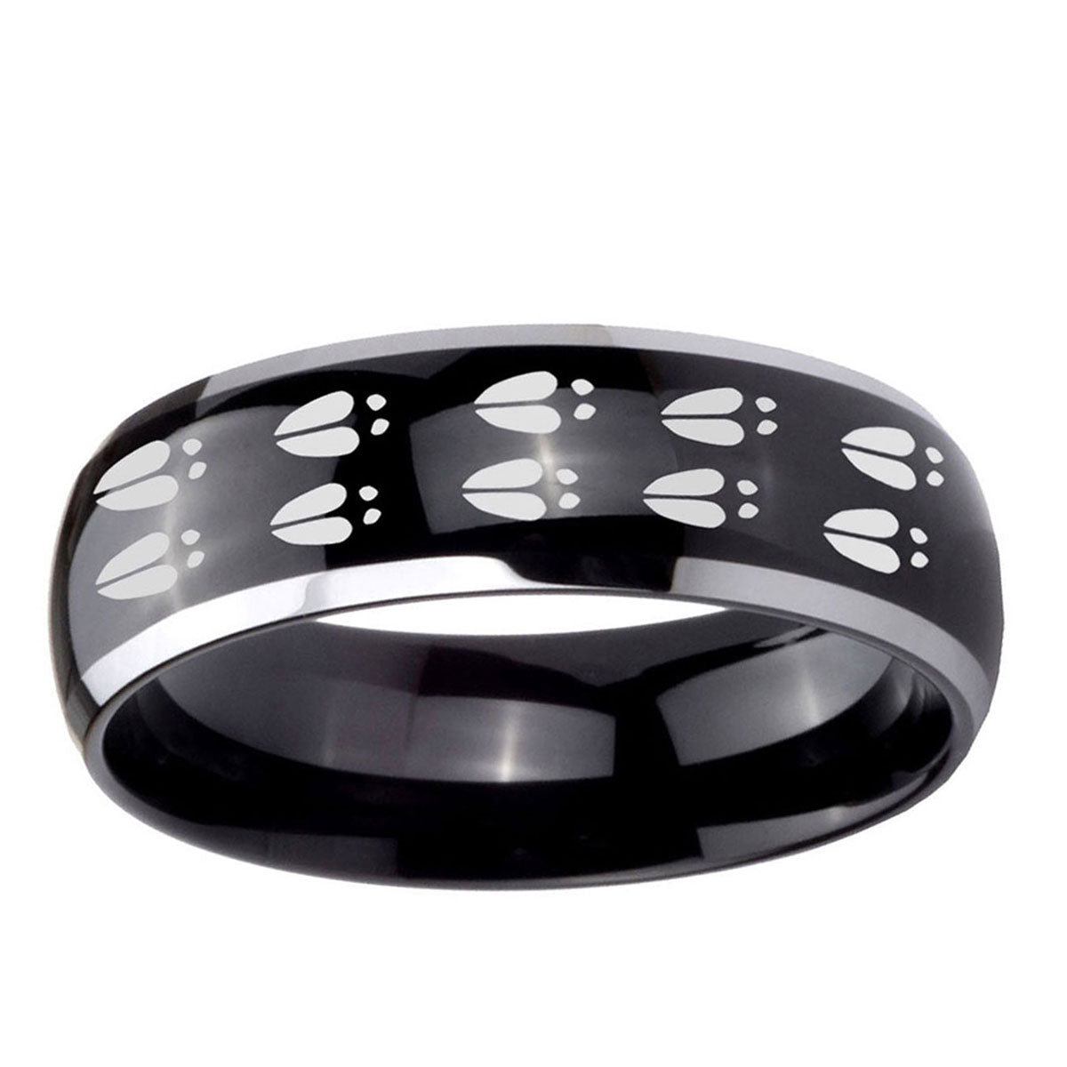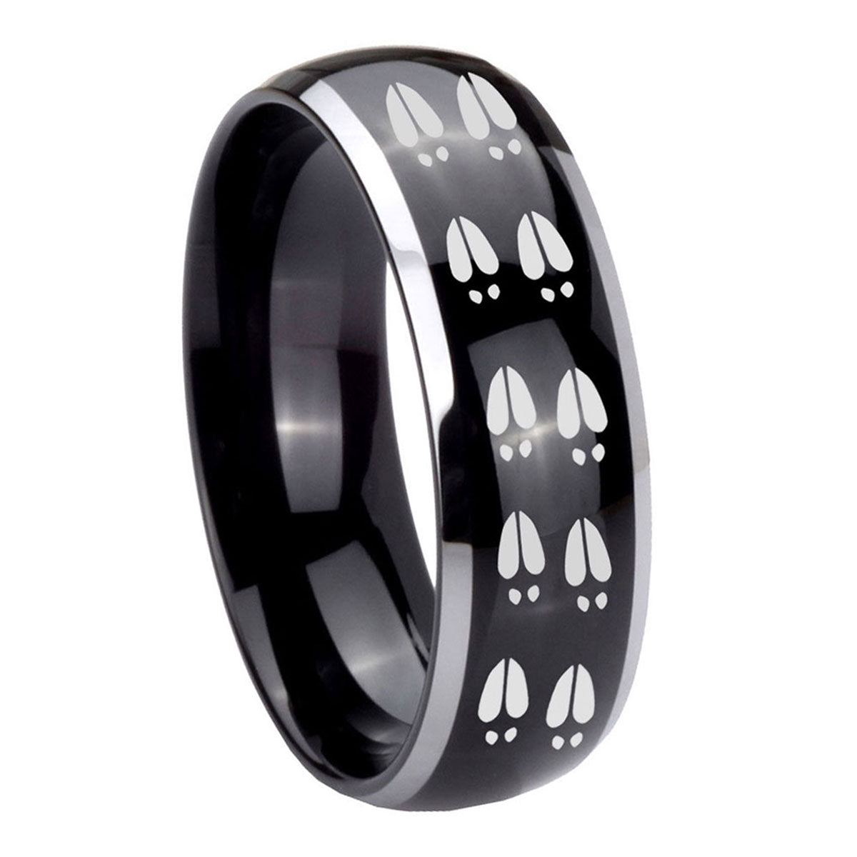 Celebrate with the 10mm Deer Tracks Dome Glossy Black 2 Tone Tungsten Carbide Wedding Bands Ring. This glossy black and 2-tone dome ring with Deer Tracks design is perfect for weddings.