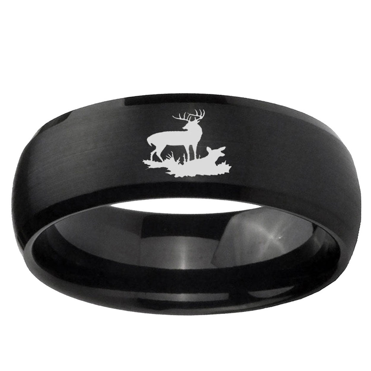 Celebrate with the 10mm Deer Hunting Dome Brush Black Tungsten Carbide Wedding Band Ring. This brushed black dome ring with Deer Hunting design is perfect for weddings.