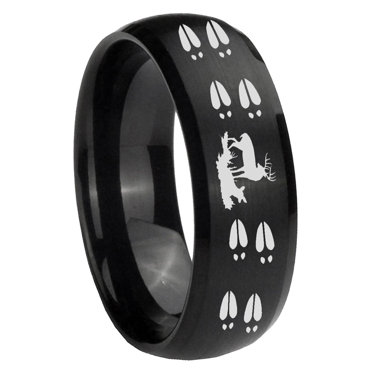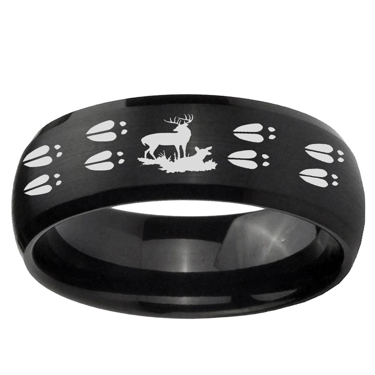 Celebrate with the 10mm Deer Hunting Tracks Dome Brush Black Tungsten Carbide Wedding Bands Ring. This brushed black dome ring with Deer Hunting Tracks design is perfect for weddings.