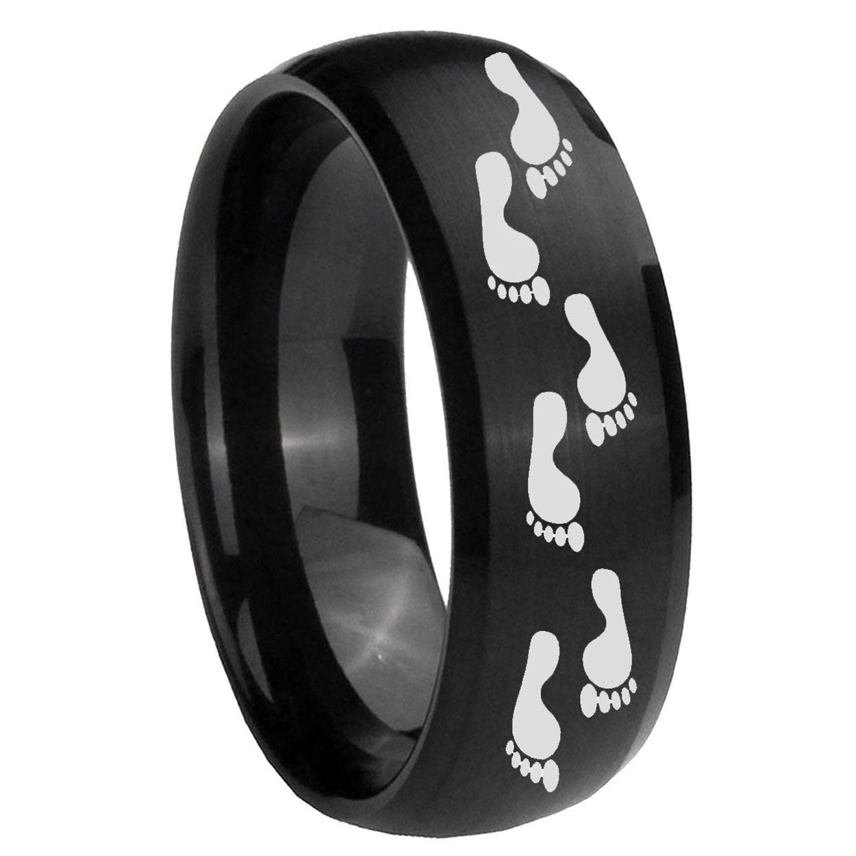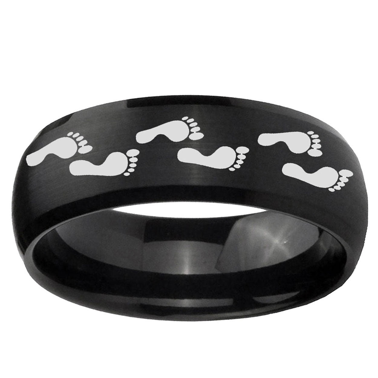 Style the 10mm Foot Print Dome Brush Black Tungsten Carbide Bands Ring. This brushed black dome ring with Foot Print design is perfect for men.