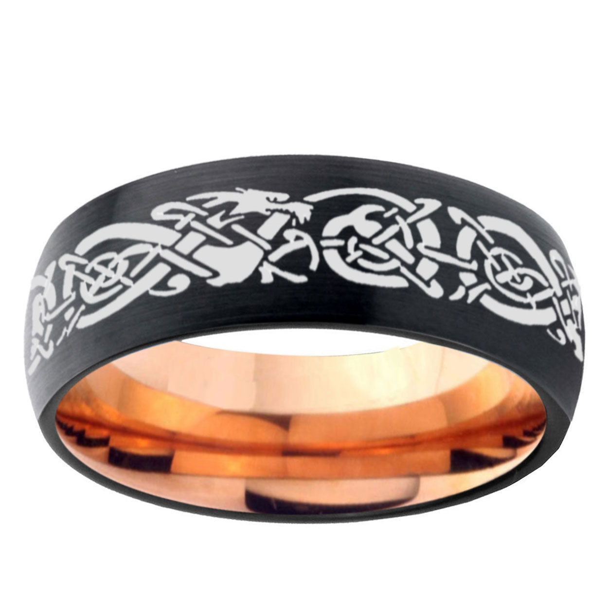 Intruding 5, 8mm Celtic Dragon Dome Tungsten Carbide Rose Gold Anniversary Ring . Offer in both 5mm and 8mm band width black and rose gold plated finished from size 4 to 14