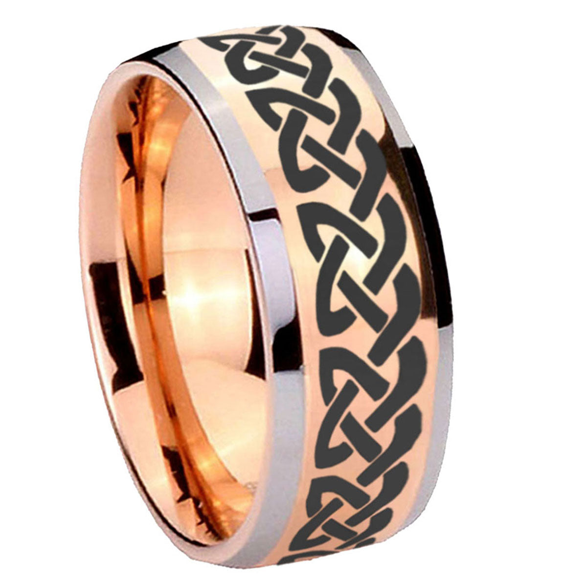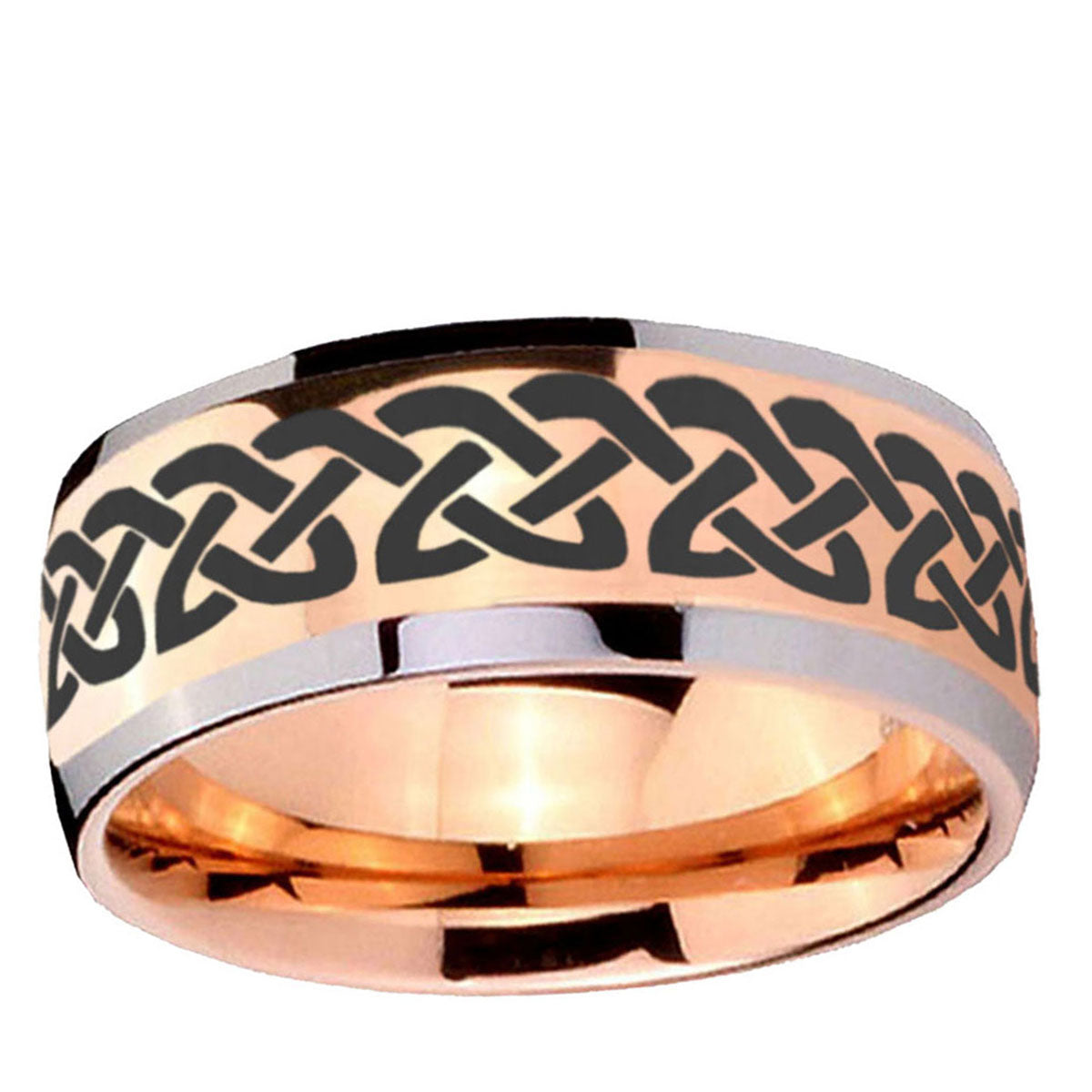 Intruding 5, 8mm Celtic Knot Love Dome Rose Gold Tungsten Carbide Custom Mens Ring . Offer in both 5mm and 8mm band width two tone rose gold plated finished from size 4 to 14