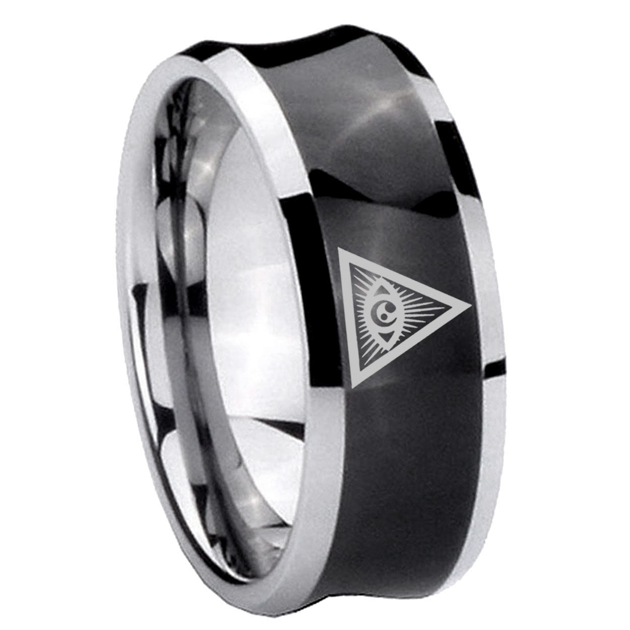 Intruding 5, 8mm Seeing Eye of God Concave Black Mens Wide Band Rings . Offer in both 5mm and 8mm band width black plated two tone finished from size 4 to 14