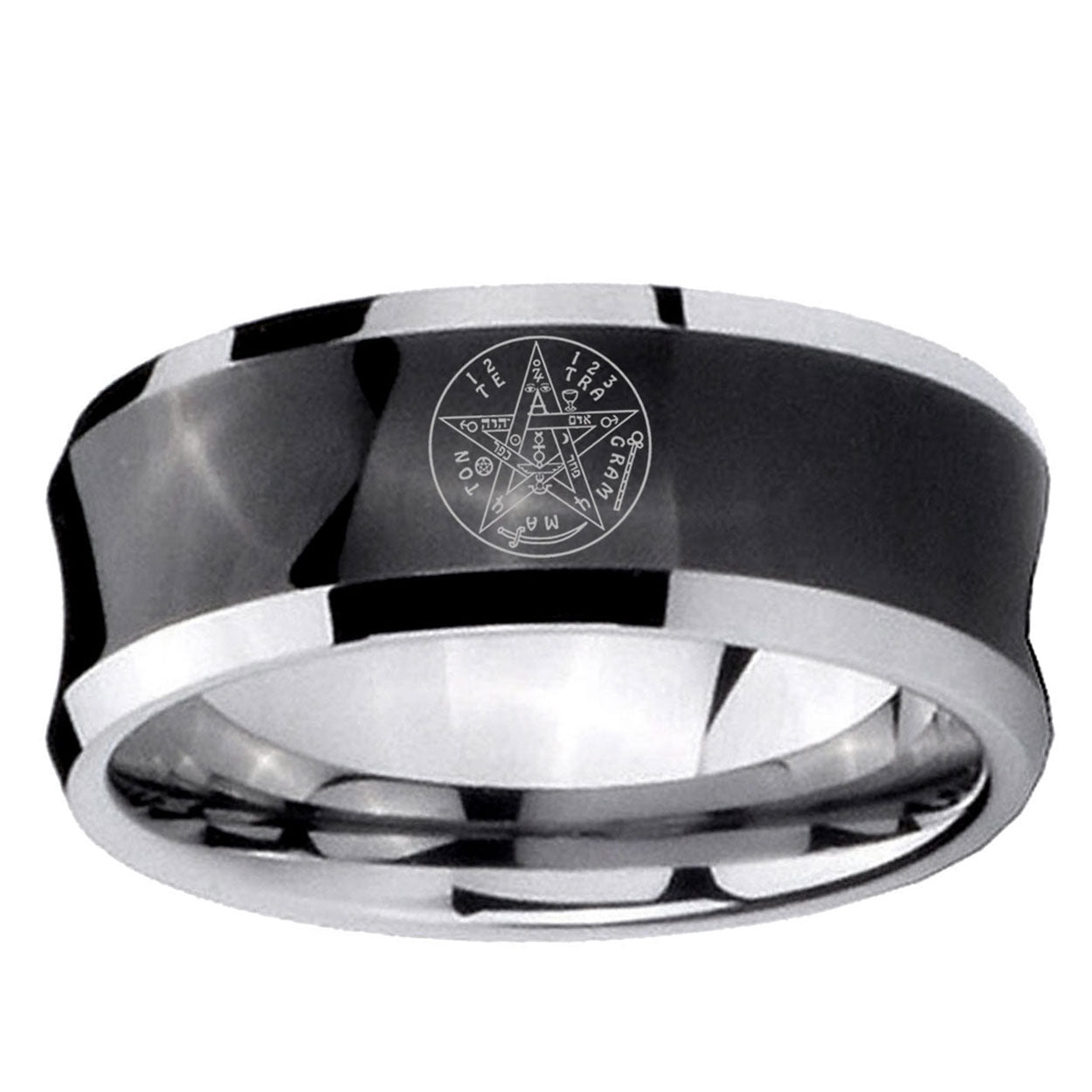 Intruding 5, 8mm Tetragrammaton Spiritual Kabbalah Concave Black Mens Wide Band Rings . Offer in both 5mm and 8mm band width black plated two tone finished from size 4 to 14