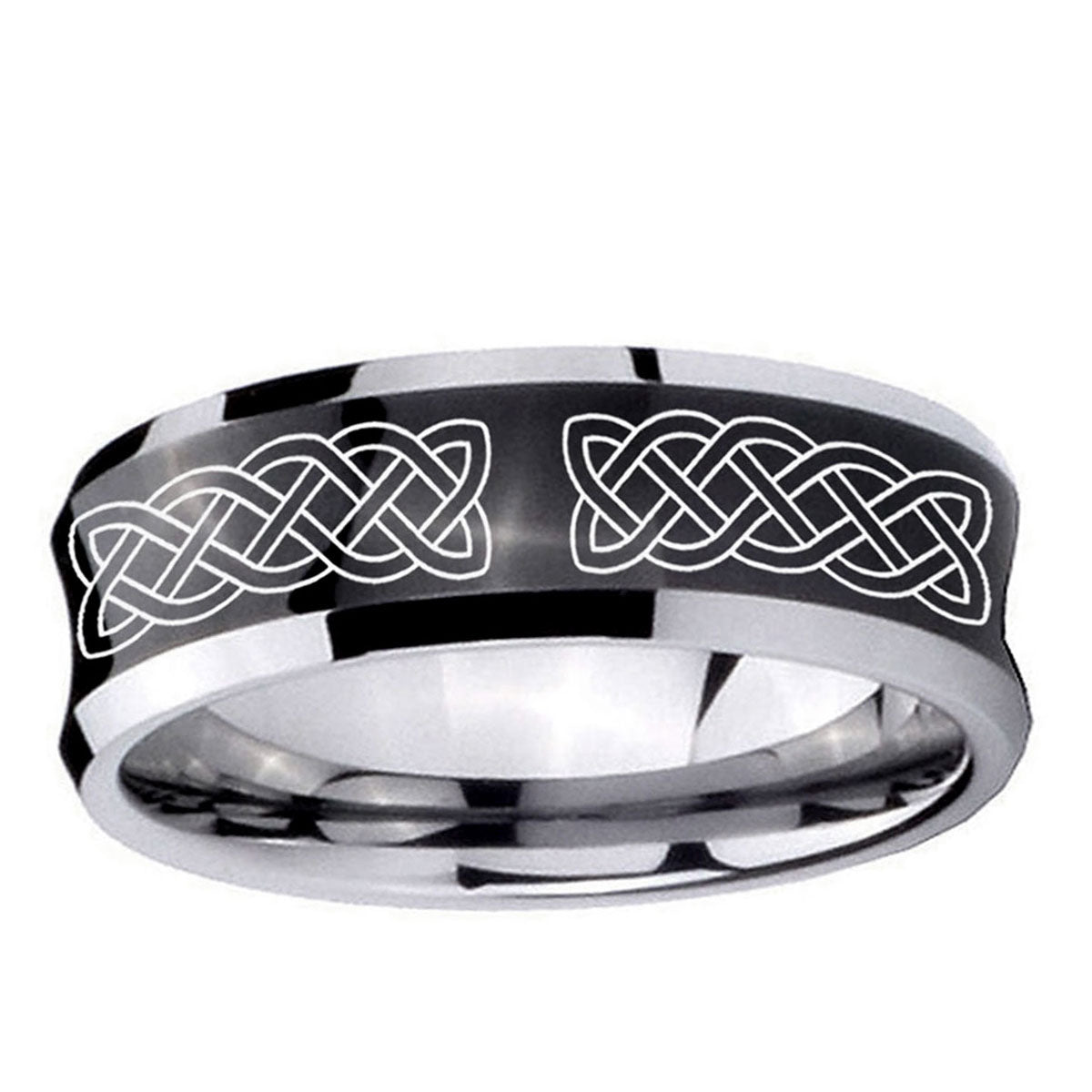 Intruding 5, 8mm Celtic Knot Concave Black Tungsten Carbide Custom Mens Ring . Offer in both 5mm and 8mm band width black plated two tone finished from size 4 to 14