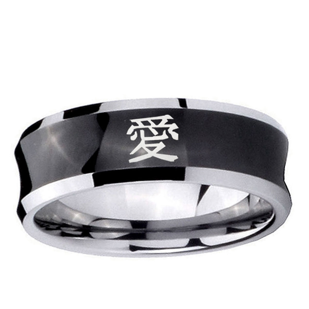 Propose with the 10mm Kanji Love Concave Black Tungsten Carbide Men's Engagement Ring. This concave black tungsten ring with Kanji Love design is ideal for engagements.