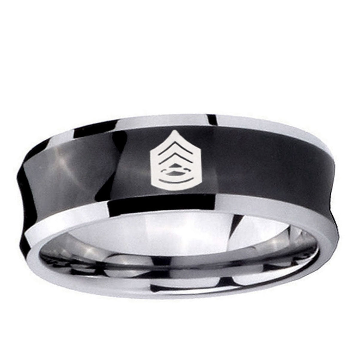 Intruding 5, 8mm Army Sergeant Major Concave Black Tungsten Carbide Engraved Ring . Offer in both 5mm and 8mm band width black plated two tone finished from size 4 to 14
